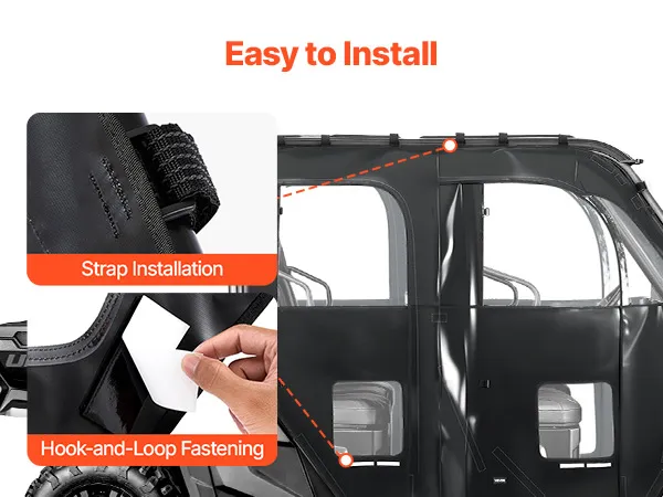 No tools or drilling is needed. You can easily secure these UTV cab enclosures with straps and hook-and-loop fasteners for a snug, hassle-free setup. Pre-cut mirror slots fit most side mirrors—no disassembly required.