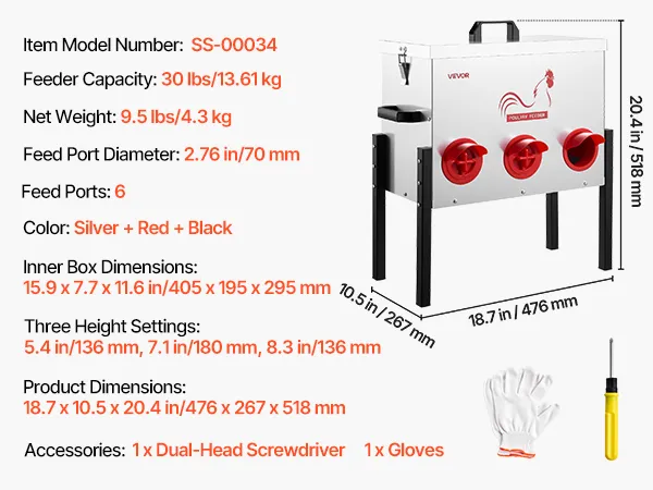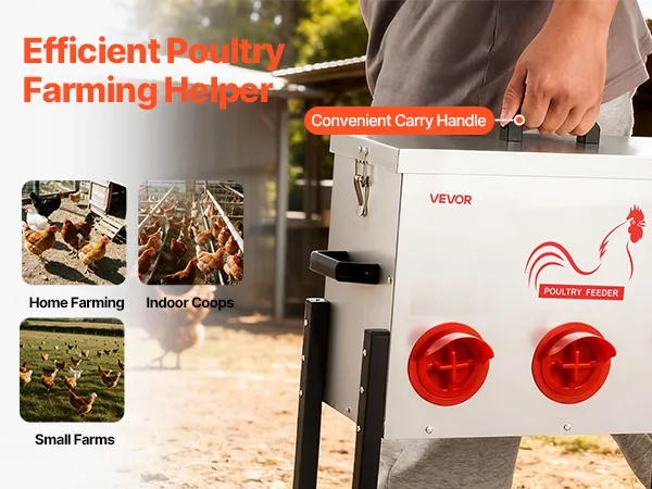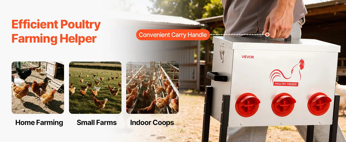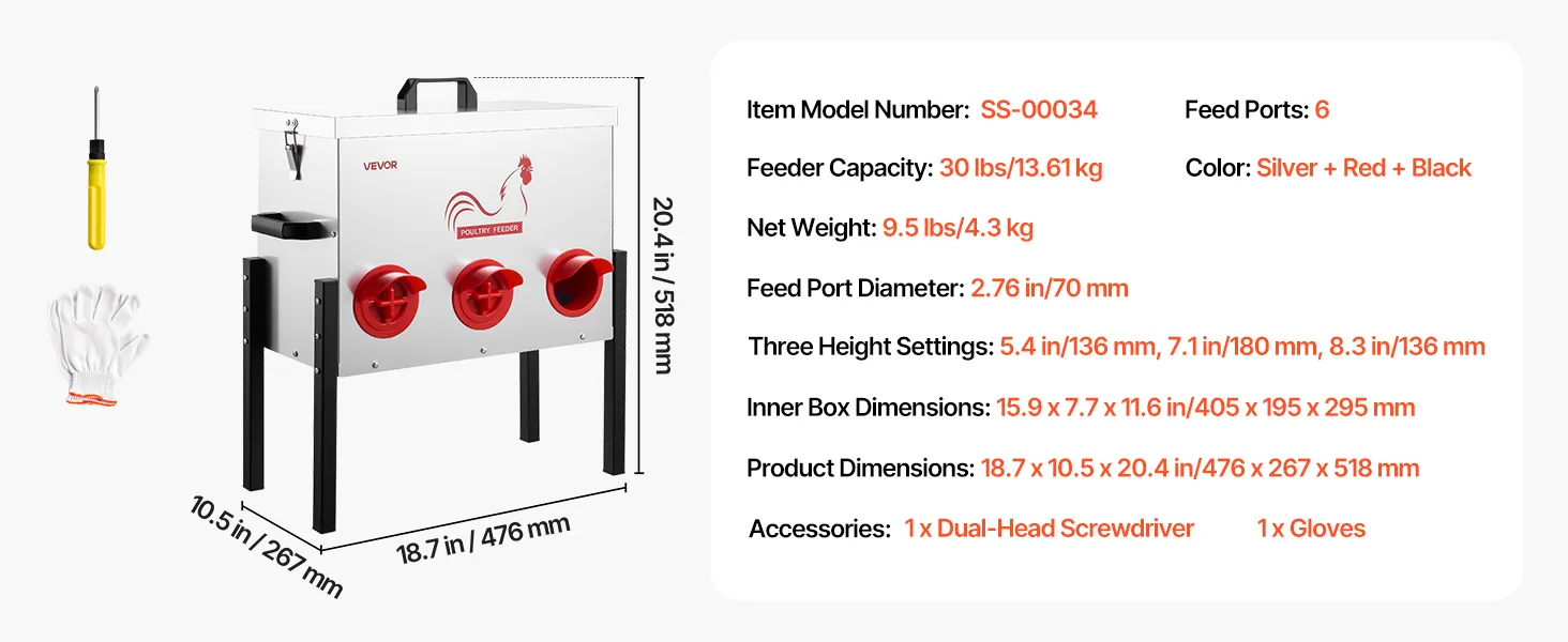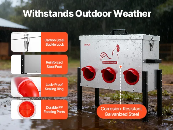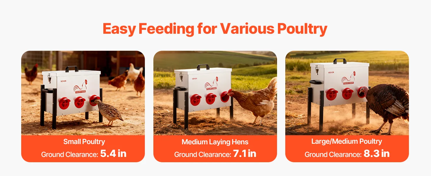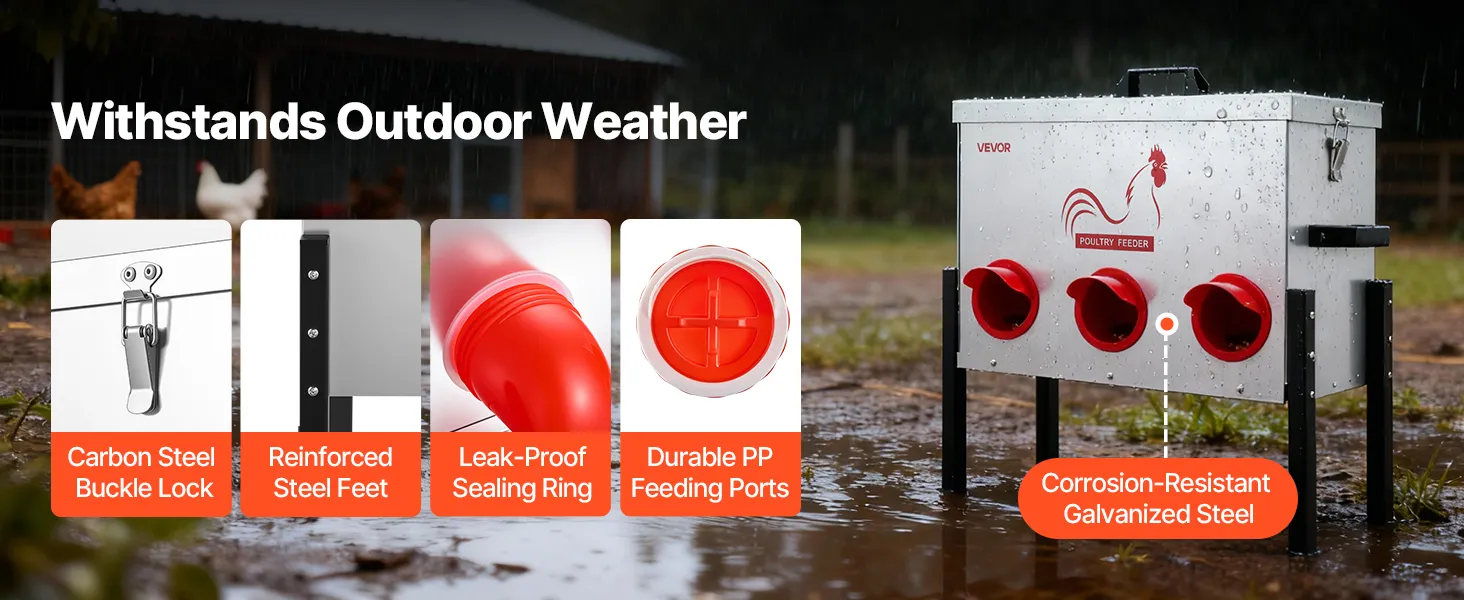 Durable & Built to Last: Made from galvanized steel with PP feed ports, this waterproof chicken feeder is rust-and corrosion-resistant and easy to clean. Reinforced steel legs suit indoor or outdoor use. With a detailed manual and tools for quick assembly