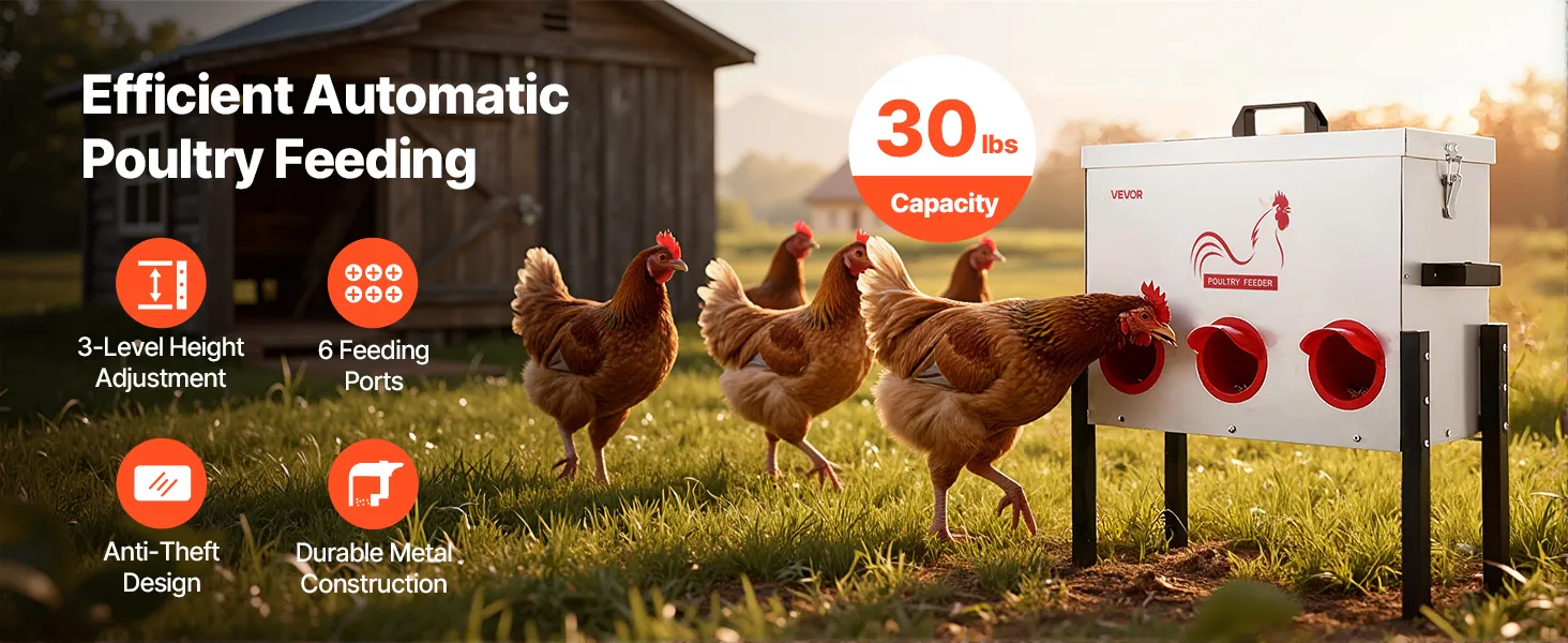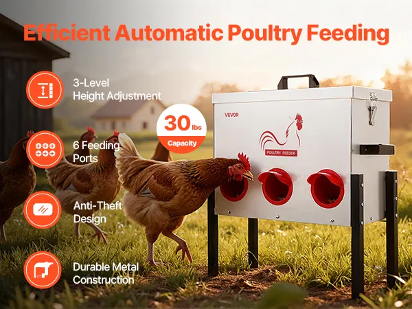 This 30 lbs capacity metal automatic chicken feeder features six feeding ports, allowing multiple poultry to feed simultaneously. With a gravity-fed design, it automatically replenishes feed, saving on feed consumption.