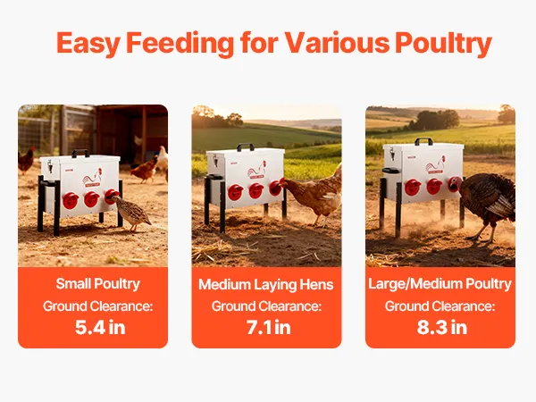 The automatic poultry feeder stand provides three height settings from 5.4 to 8.3 inches, allowing you to easily adjust it for different poultry sizes. Suitable for feeding small to medium-large birds for long-term, convenient use.