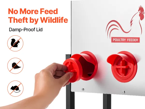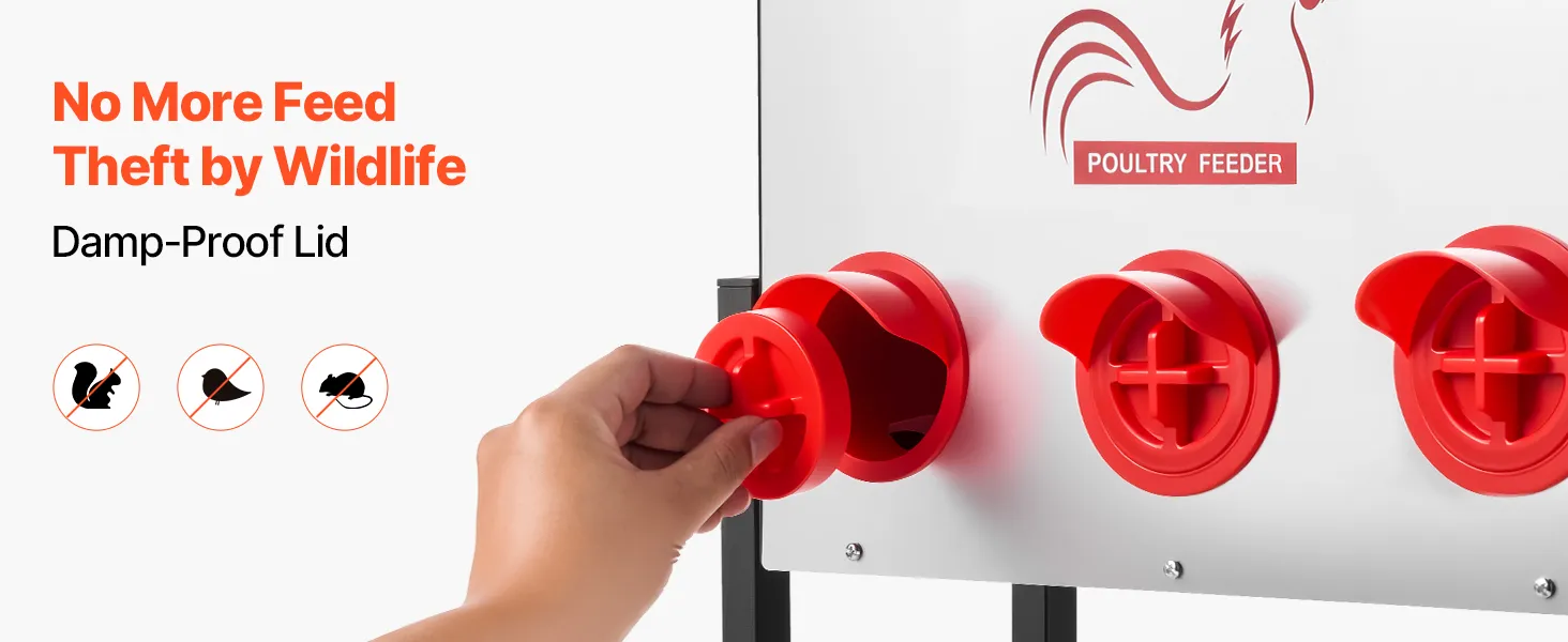 Our chicken feeder comes with feeding ports with damp-proof covers to block squirrels, birds, rodents, and other animals from stealing the feed. It helps reduce feed loss outdoors, ensuring your feed stays secure.