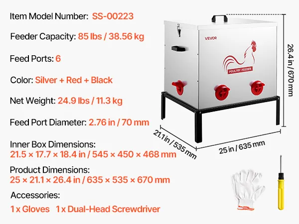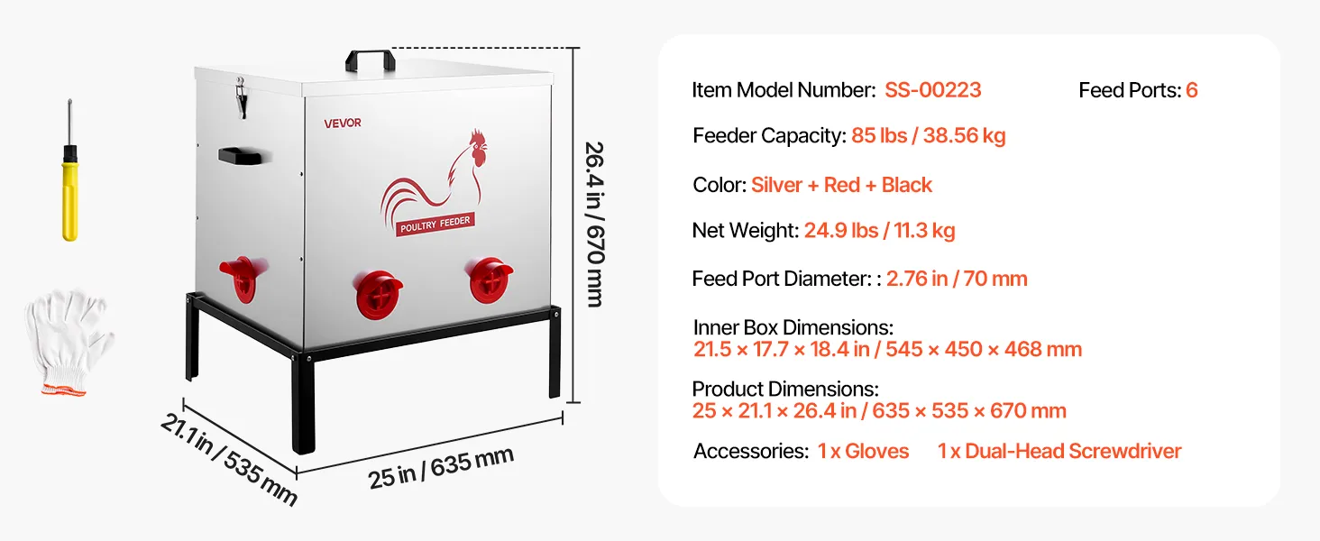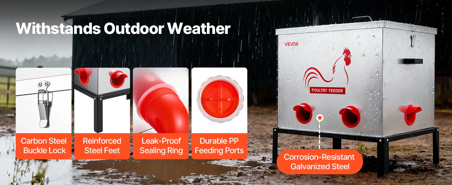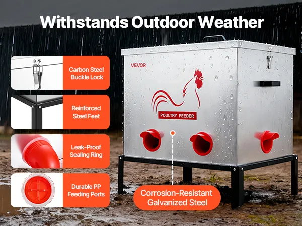 Durable & Built to Last: Made from galvanized steel with PP feed ports, this waterproof chicken feeder is rust-and corrosion-resistant and easy to clean. Reinforced steel legs suit indoor or outdoor use. With a detailed manual and tools for quick assembly