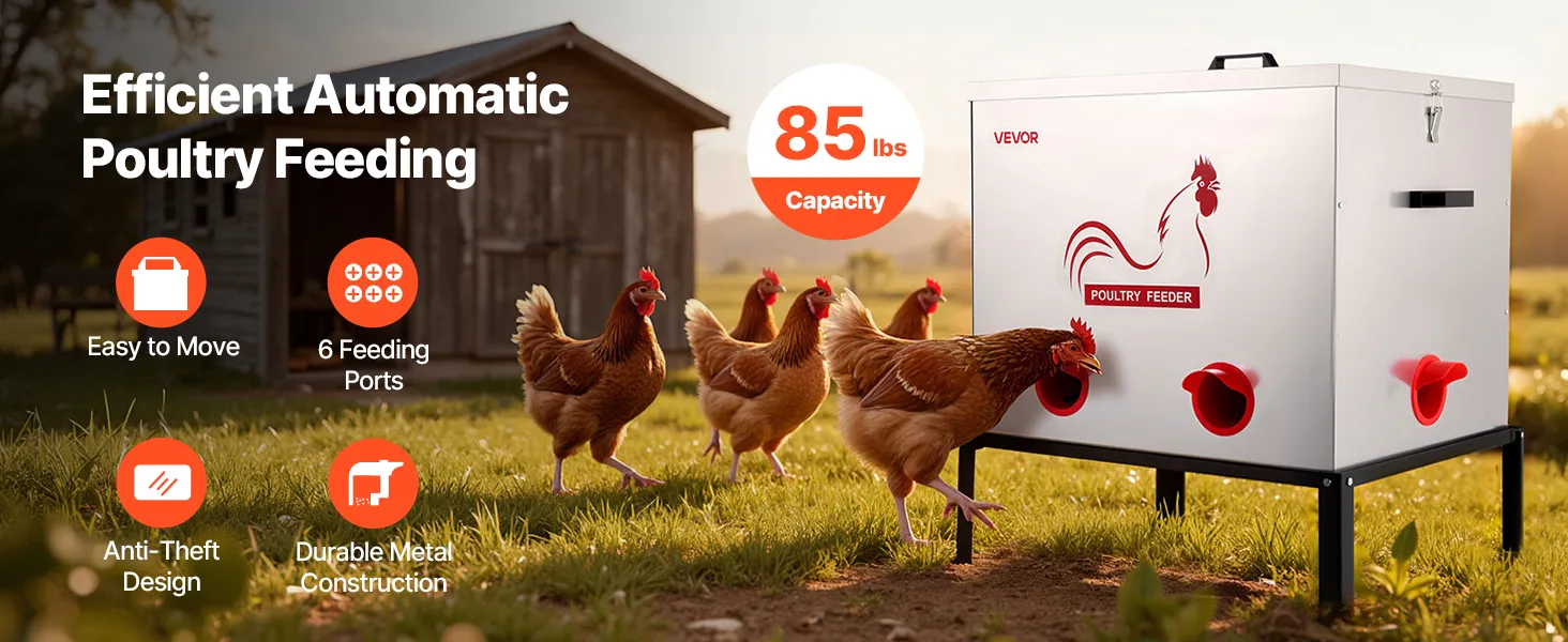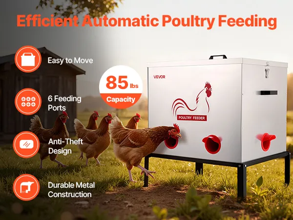85 lbs Large Capacity: This automatic chicken feeder holds 85 lbs of small pellets, crumbs, or crushed feed, providing 26–33 days of feed for 10–12 adult chickens. The 6 feeding ports allow multiple chickens to feed at once, saving time and daily refills