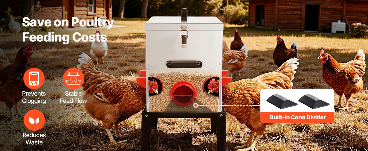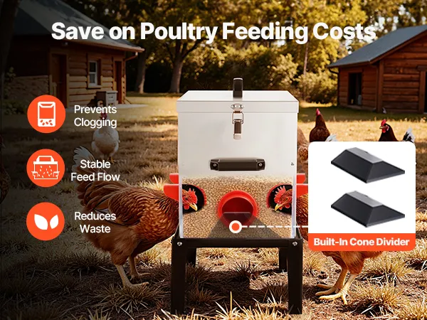 Cleaner Coop, Less Waste: Say goodbye to messy, scattered feed. The automatic chicken feeder keeps your coop tidy. The built-in cone divider ensures even feed flow for easy feeding. It reduces waste and minimizes feed usage, saving time and money