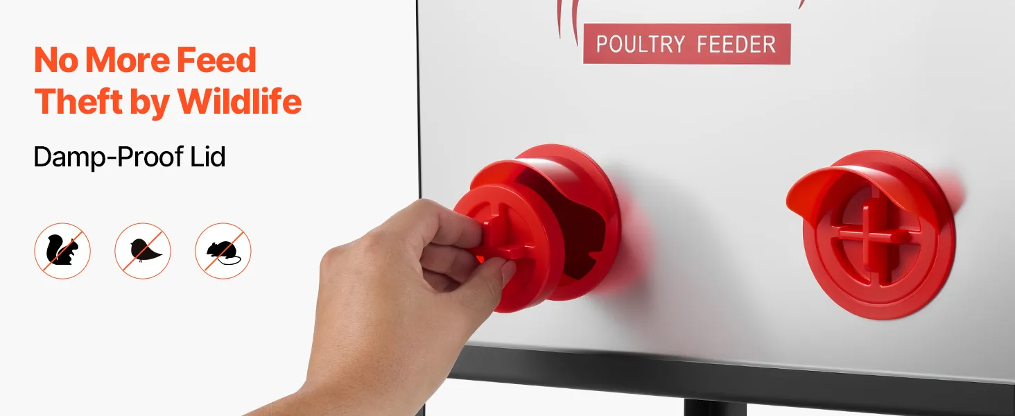 Our chicken feeder comes with feeding ports with damp-proof covers to block squirrels, birds, rodents, and other animals from stealing the feed. It helps reduce feed loss outdoors, ensuring your feed stays secure.