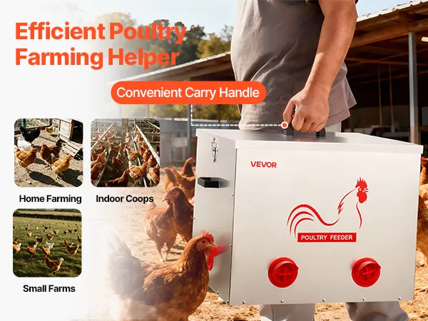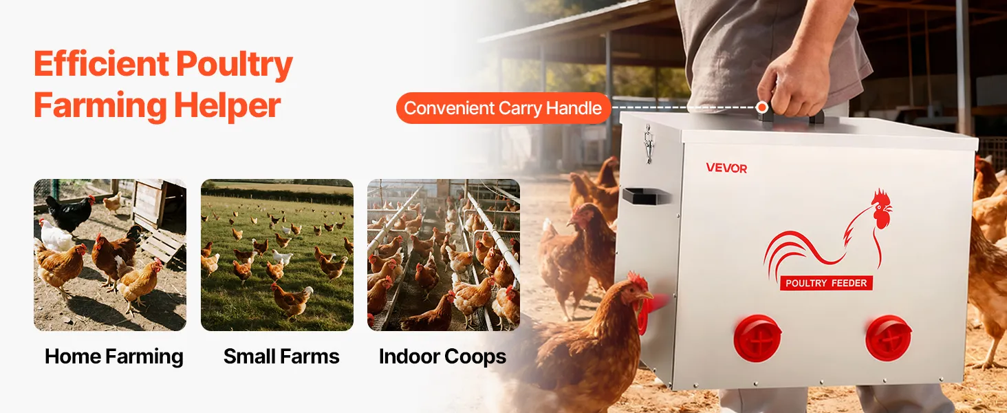 Easy to Move Anywhere: This auto chicken feeder comes with handles on both sides and the top, allowing for easy relocation. It simplifies daily feeding, reduces the hassle of carrying heavy feed containers, and makes poultry care more convenient