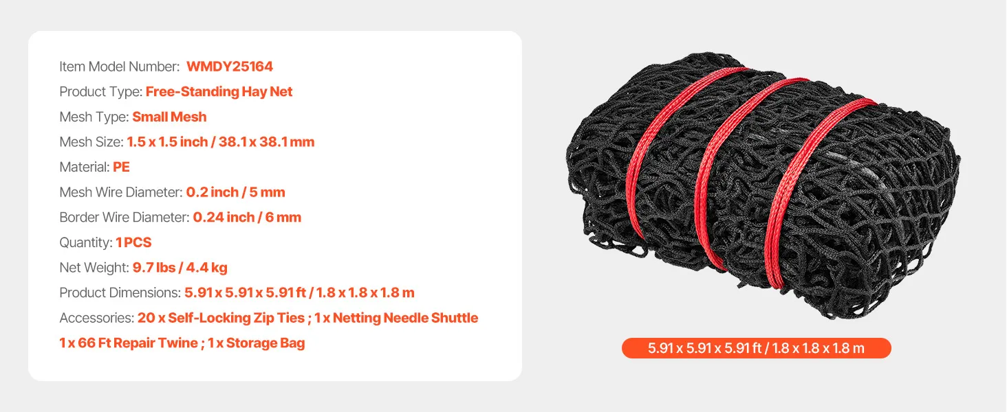VEVOR Round Bale Hay Net, 1.8 x 1.8 x 1.8 m, 38.1 x 38.1 mm Holes, PE Material, Knotless Design, with Zip Ties, Needle Shuttle, Repair Twine and Storage Bag, Slow Feeder Round Bale Net for Horses