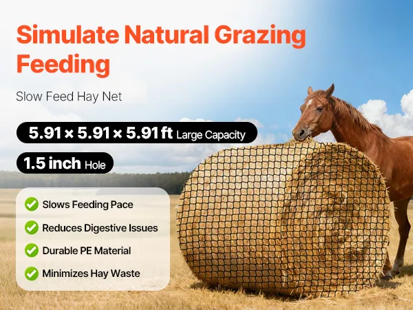 Featuring 1.5-inch mesh, this slow-feed round bale net suits most horses for daily use, promoting gradual feeding, reducing hay waste, and supporting better digestion.