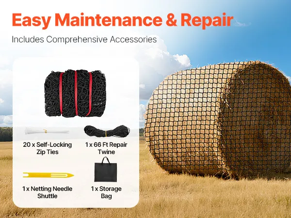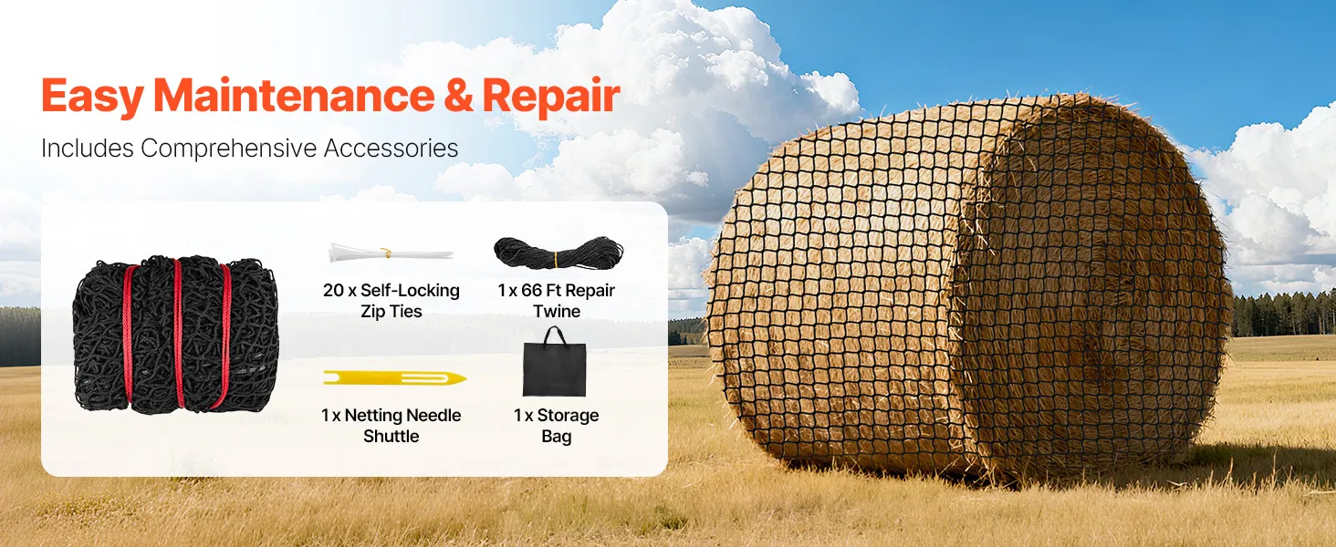 This hay bale net allows quick repairing and partial replacements with included repair accessories. It enables simple maintenance and extends lifespan, reducing replacement costs for long-term, cost-effective use.