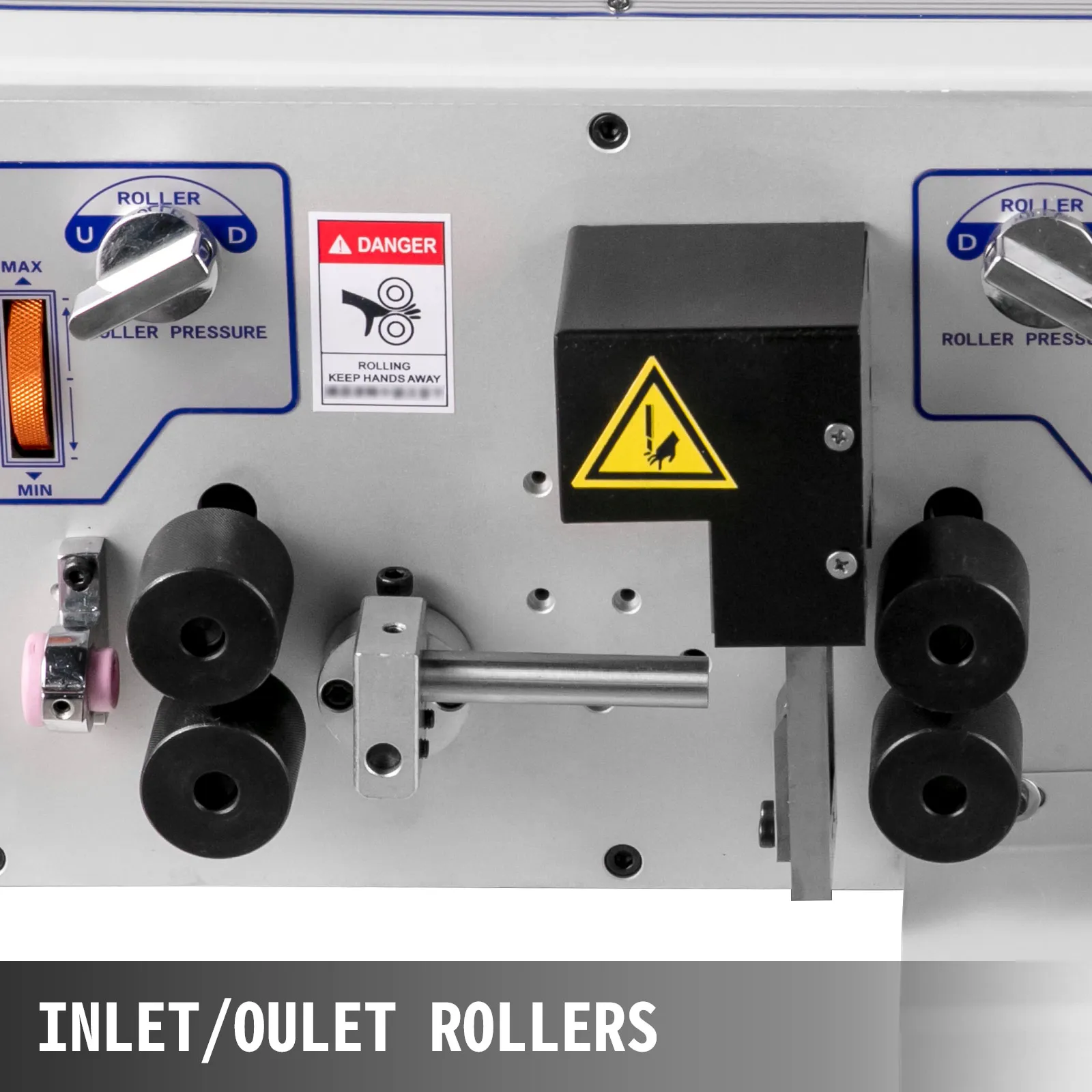 The electric wire stripping tool features an inlet roller and an outlet one. You can adjust their pressure by turning the orange switches beyond them account for wires of different materials.
