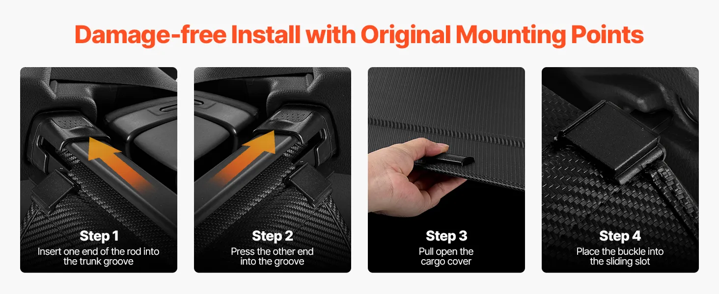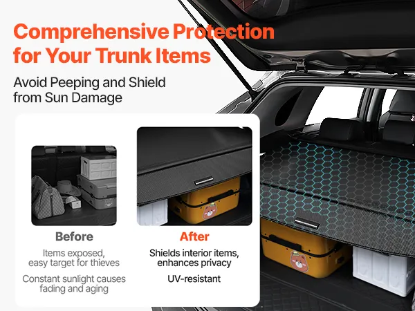 Privacy Shield: Our retractable trunk cover effectively hides luggage, shopping bags, and valuables, helping lower the risk of theft. It also blocks direct sunlight to slow the fading and aging of items stored in your trunk