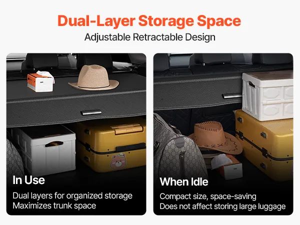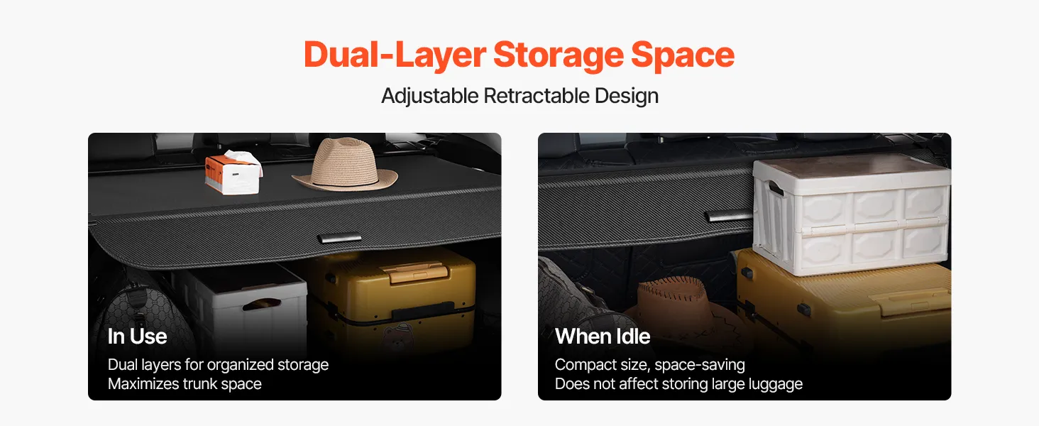 Flexible Extension: The privacy cargo cover features an adjustable design that creates a double-layer storage area. You can sort items on separate levels or retract the cover to fit larger cargo for different travel needs