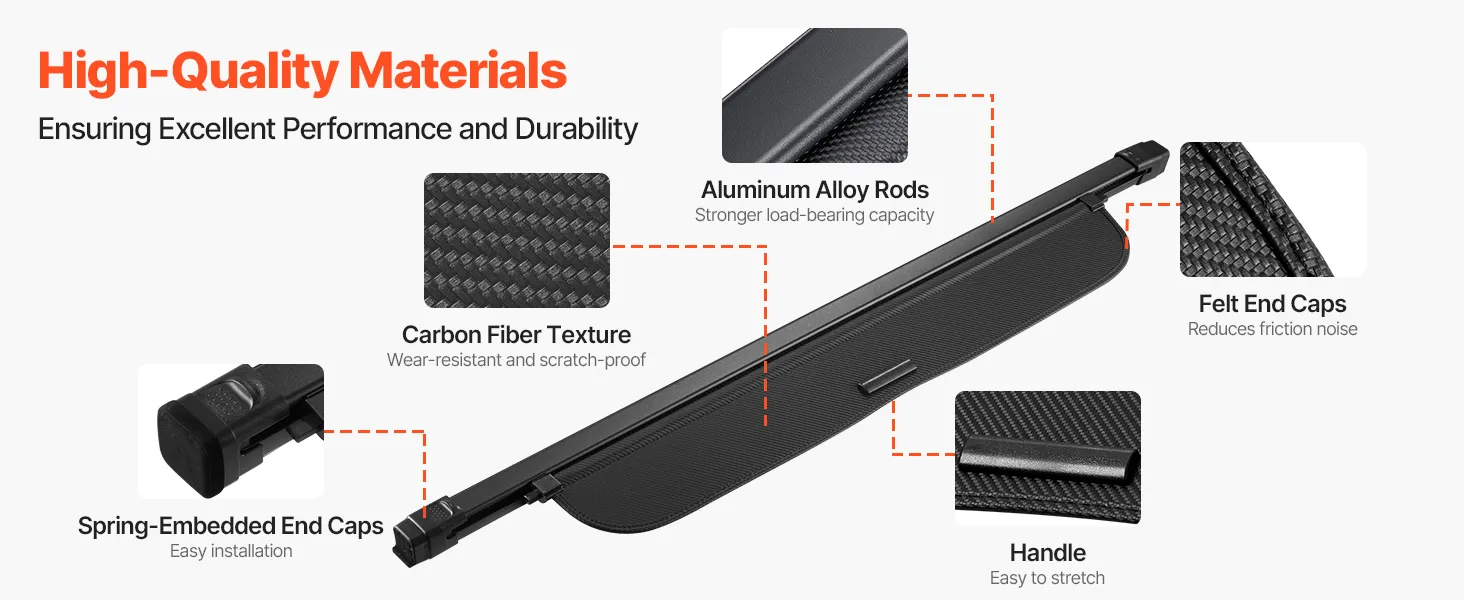 Made from aluminum alloy, nylon, and PVC, this cargo cover is wear-resistant, scratch-resistant, lightweight, and easy to clean. It stays reliable and good-looking over long-term use.