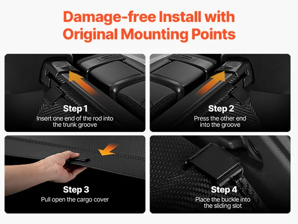 No extra tools are required. You can simply slot the security shade cover into the original trunk grooves for quick setup. Note: Please do not strike the ends of the mounting posts to avoid spring failure.