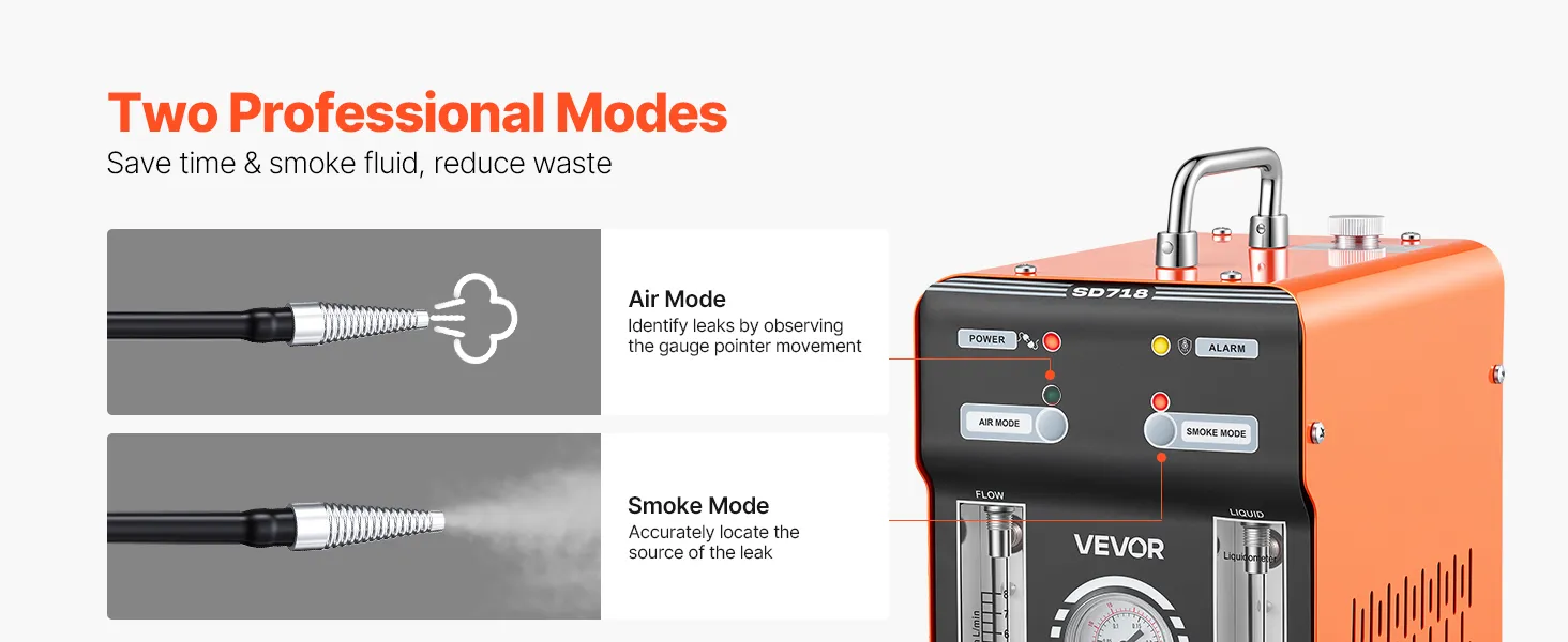 • Dual-Mode Testing: Our automotive smoke tester allows you to use Air Mode first to check the system sealing condition. Then switch to Smoke Mode to visually locate leak points, reducing unnecessary smoke fluid consumption