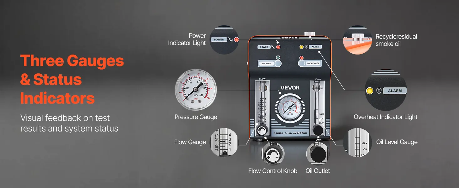 • Triple-Gauge Assistance: The automotive smoke machine features a pressure gauge to quickly identify major leaks. The flow meter and flow control knob help detect small leaks, while the oil level window allows you to monitor the remaining smoke fluid