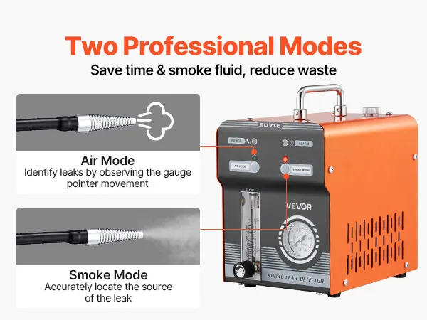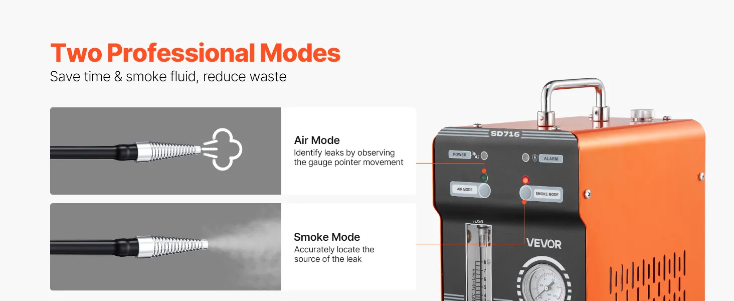 Dual-Mode Testing: Our automotive smoke tester allows you to use Air Mode first to check the system sealing condition. Then switch to Smoke Mode to visually locate leak points, reducing unnecessary smoke fluid consumption