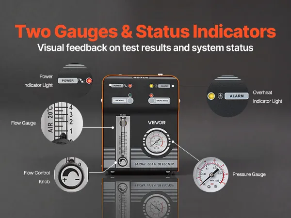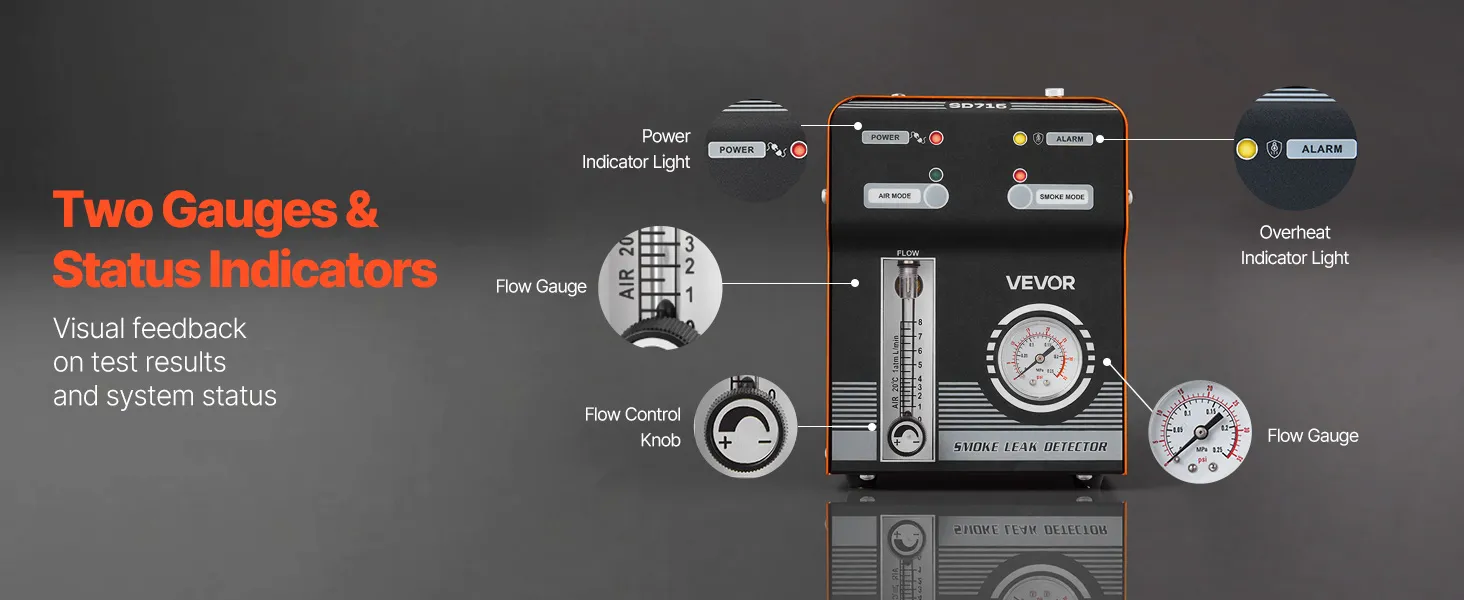 Dual-Gauge Assistance: The automotive smoke machine features a pressure gauge to quickly identify major leaks. The flow meter and flow control knob help detect small leaks for more accurate diagnosis