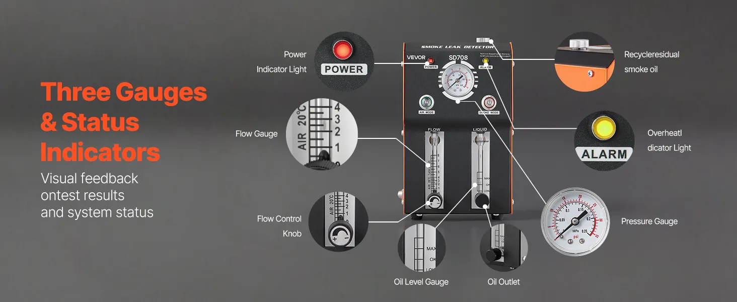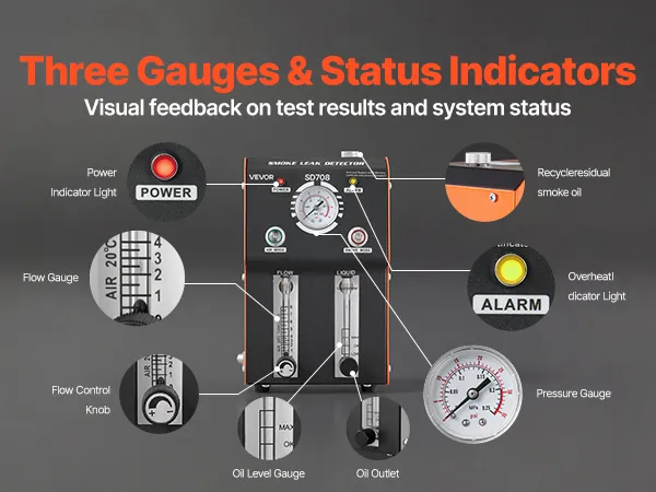 Triple-Gauge Assistance: The automotive smoke machine features a pressure gauge to quickly identify major leaks. The flow meter and flow control knob help detect small leaks, while the oil level window allows you to monitor the remaining smoke fluid