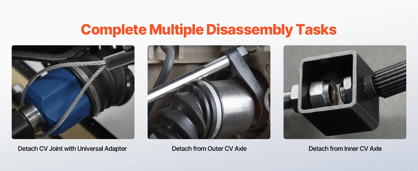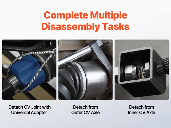 • Three Removal Tools: This slide hammer puller set includes a heavy-duty slide hammer, 2-inch & 2.5-inch CV joint forks, a steel cable adapter, and an outer CV adapter. Swap parts as needed for fast axle/CV joint removal