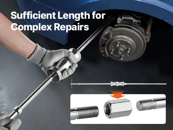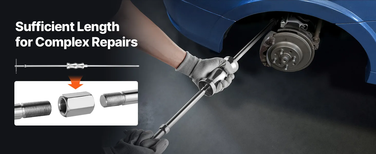 The slide hammer connects to a bolt-on extension rod, providing extra length to reach deeper axle assemblies in tight spaces.