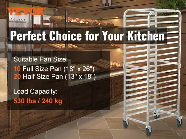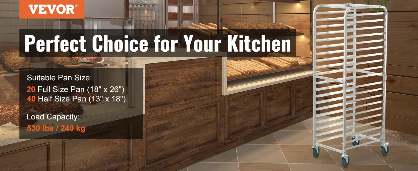 The VEVOR Bun Pan Rack is ideal for commercial use, with a load capacity of 530 lbs. Its strong construction is built to withstand heavy loads, making it suitable for busy bakeries and professional kitchens. Unlike other commercial bakery racks, this durable rack helps streamline operations by securely holding multiple items. Its high capacity eliminates the need for additional storage, saving both space and time in demanding environments.