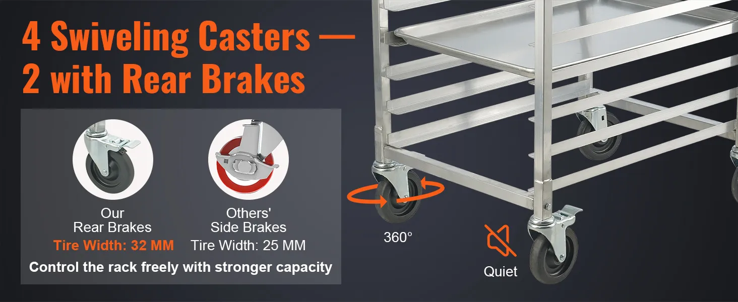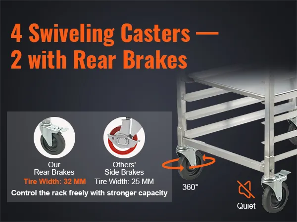 Equipped with high-quality rubber brake wheels, the VEVOR Bun Pan Rack offers effortless mobility. The wheels ensure smooth movement across various floor surfaces, while the brake system keeps the rack securely in place when needed. This feature makes the rack especially useful as a speed rack for kitchen tasks, allowing safe and efficient transportation of heavy loads without compromising stability.
