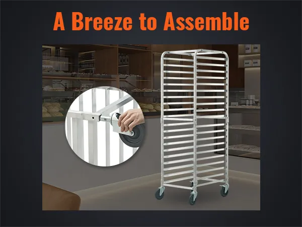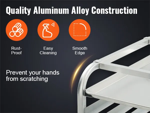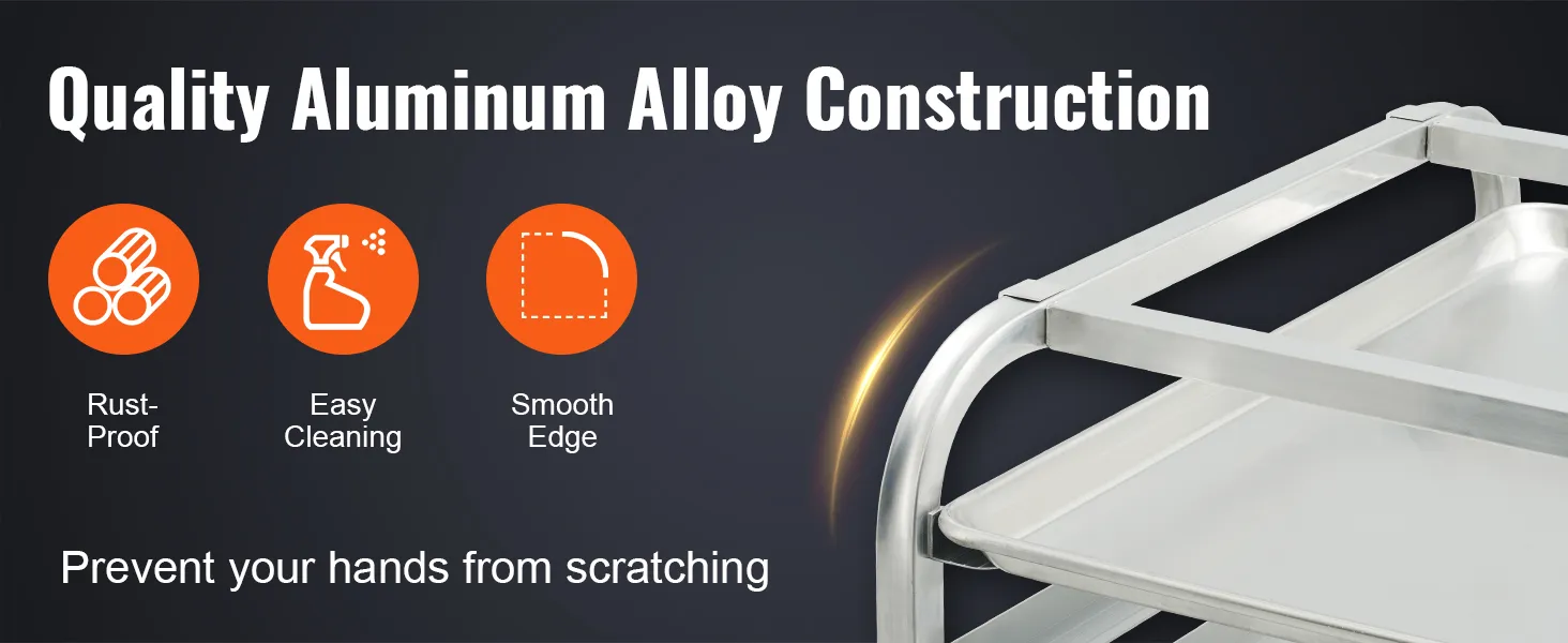 Assembling the VEVOR Bun Pan Rack is quick and hassle-free, taking just 15-20 minutes. Made from high-quality aluminum alloy, it is lightweight yet strong enough to support up to 530 lbs. This aluminum racking trolley combines durability and portability, ensuring long-term reliability while being easy to move. Its sturdy construction guarantees stability, making it a dependable choice for frequent use in any kitchen setup.