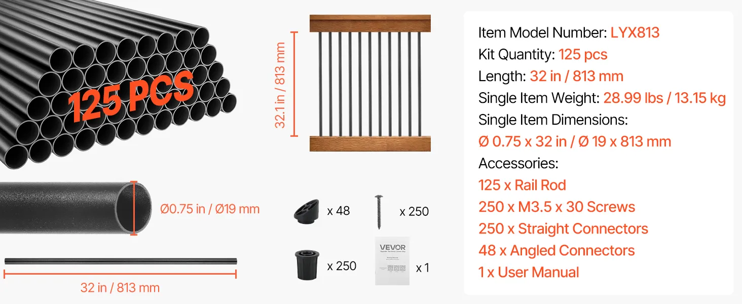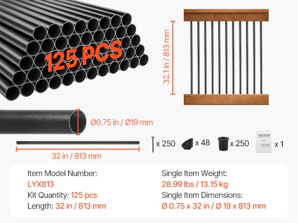 VEVOR 125 Pack Deck Balusters, 81.3 cm Aluminum Railing Spindles, 1.9 cm Diameter Hollow Round Metal Decking Stair Balusters with Connectors, Screws, for Deck, Porch & Staircase Railing Fence, Black