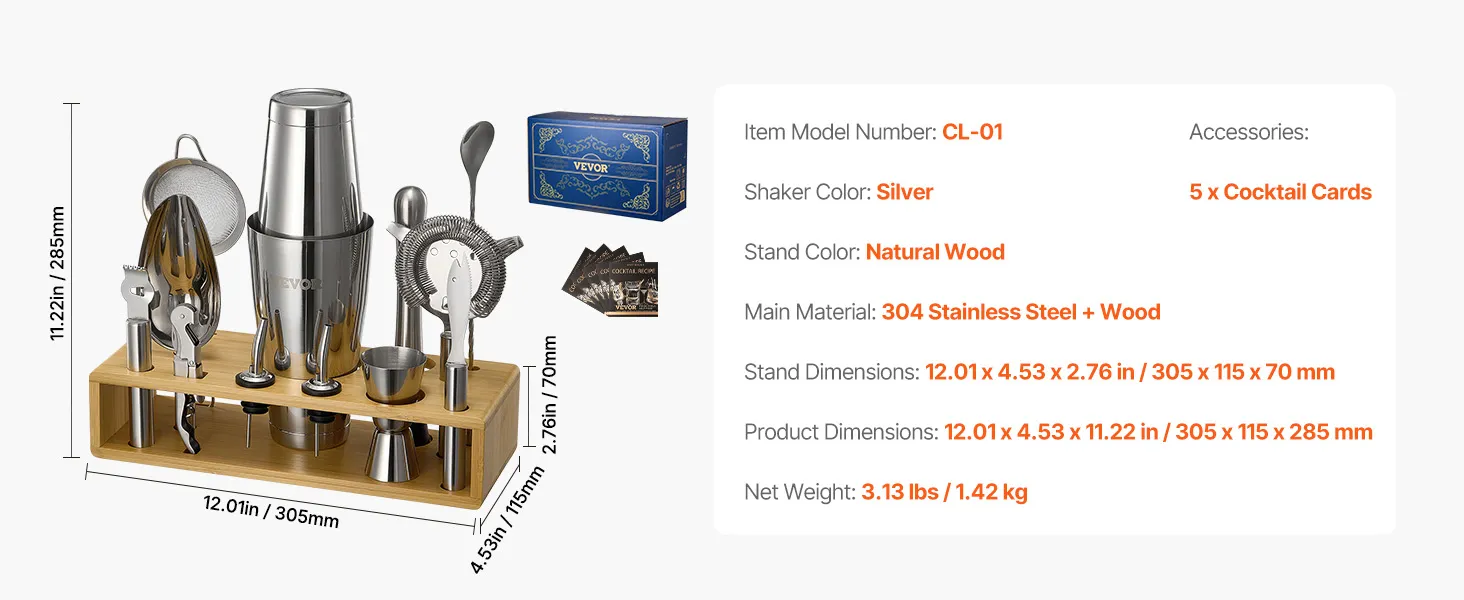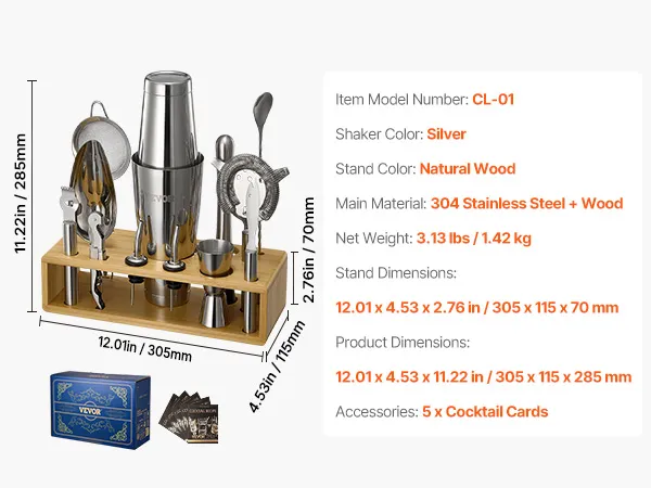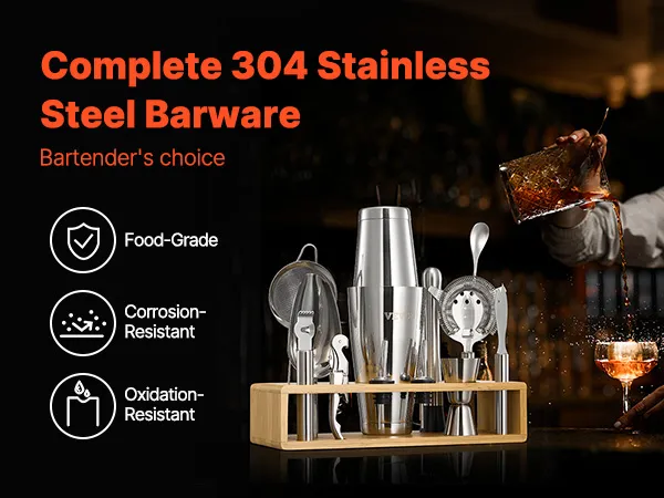 Complete Cocktail Shaker Set: The 13-piece comprehensive kit will meet all your professional bartending needs, including a boston shaker, mixer spoon, muddler, jigger, strainer, mesh strainer, two liquor pourers, ice scoop, lemon zester, corkscrew, cheese knife, and bamboo stand