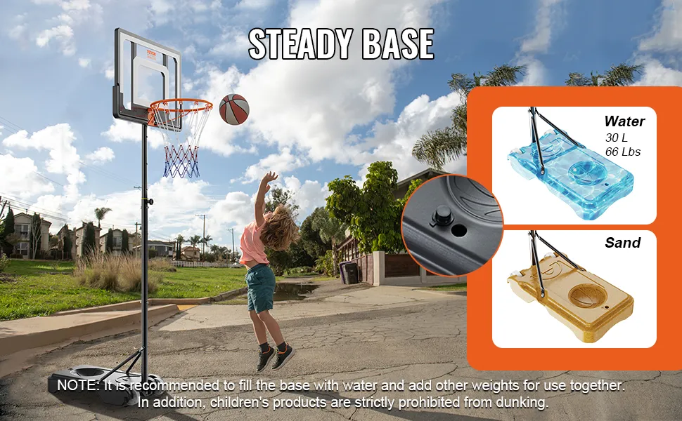 You can fill the thick, stable base of the VEVOR indoor basketball hoop with either water or sand. This feature provides excellent stability during intense play. The fillable base prevents the hoop from wobbling or tipping over. It keeps the outdoor basketball hoop firmly in place and ensures safety for all players. Added weight from the fillable base makes it secure, even during energetic games. This stability is crucial for indoor and outdoor use, ensuring the hoop remains steady in all conditions. The design of the hoop ensures it can withstand the force of shots and dunks without compromising safety, providing players with peace of mind and allowing them to concentrate on the game.