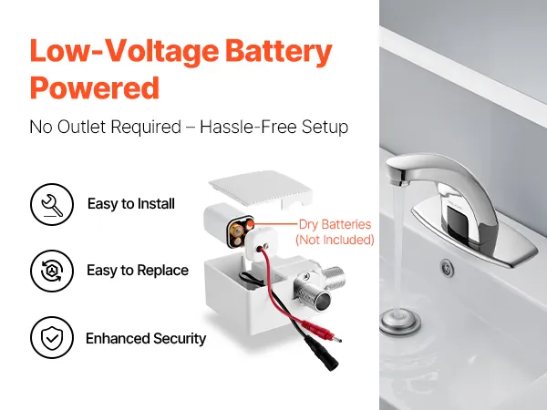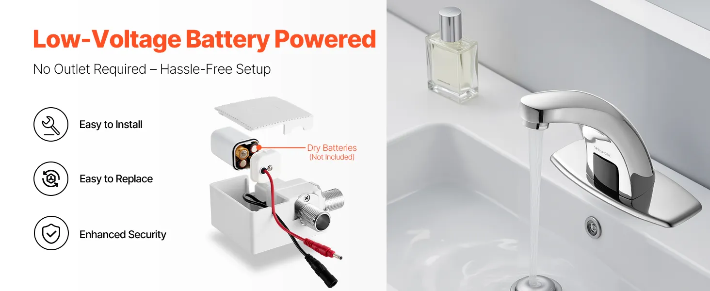 Powered by low-voltage batteries, this bathroom sink faucet is secure and easy to maintain. No complicated wiring or external power source is needed, just install and use.