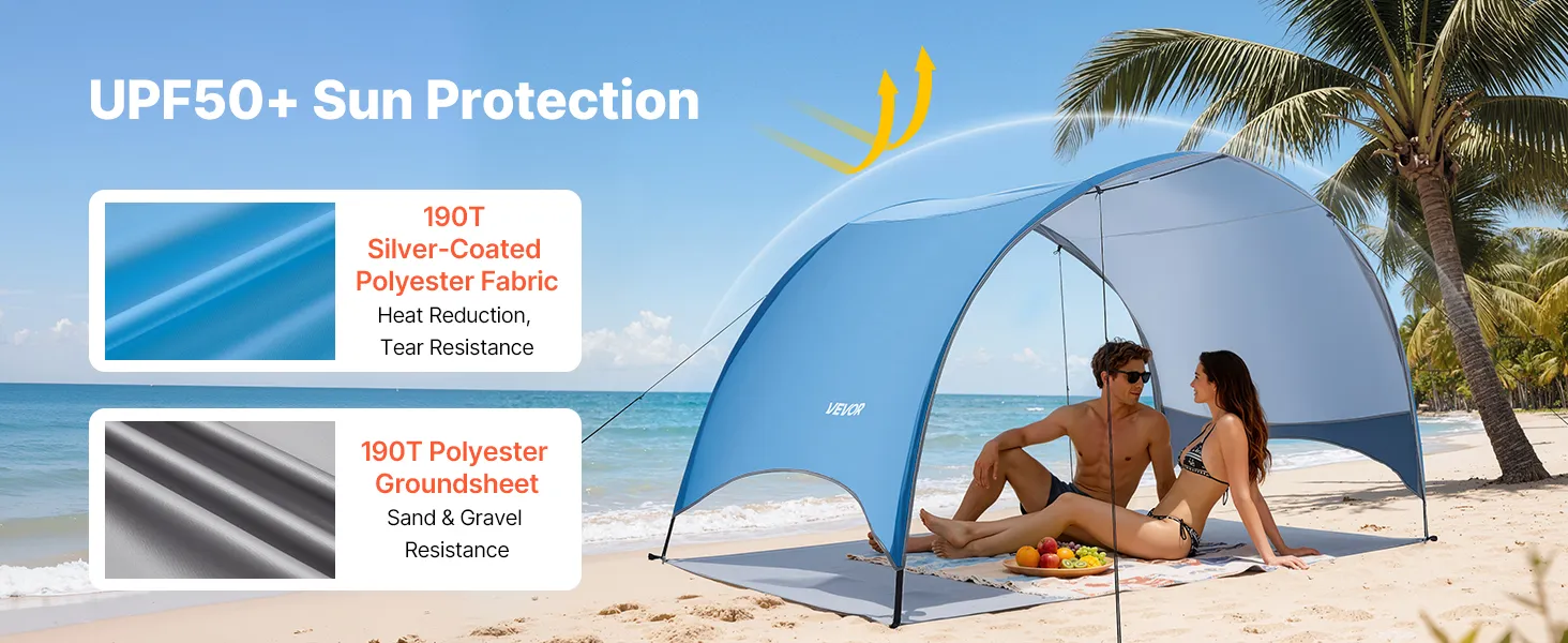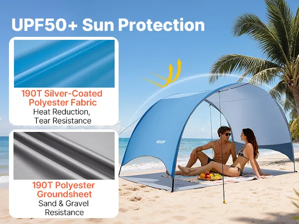 UPF 50+ Sun Protection: Crafted from 190T silver-coated polyester and boasting a UPF 50+ rating, this portable beach tent blocks harsh sunlight and provides heat insulation. The thick, durable fabric resists cracking and withstands long-term outdoor use