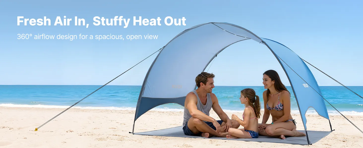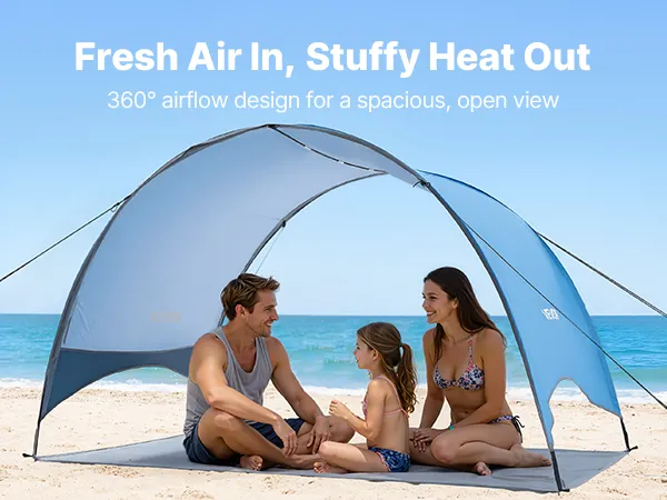 Ventilated 360° Design: Our camping sun shelter enables natural breezes under broad shade. Open sides boost airflow, reduce stuffiness, and keep sightlines clear—wider beach views with a cooler, more comfortable shelter