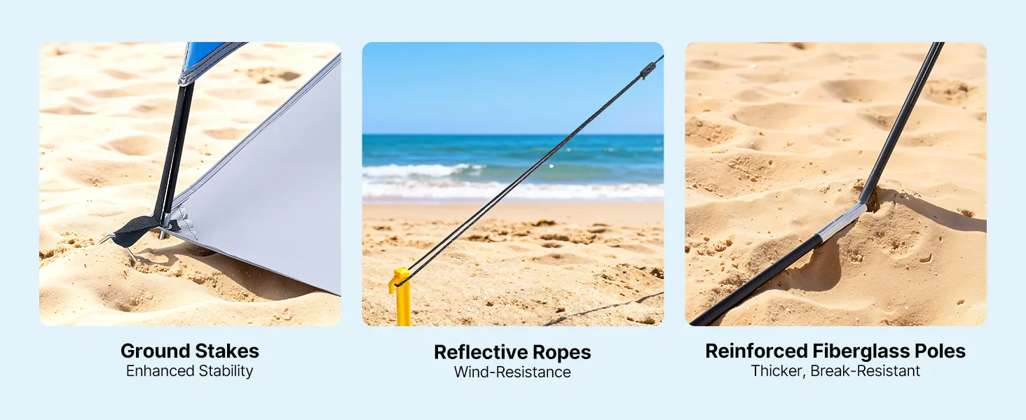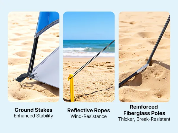 Wind-Ready Stability: Featuring upgraded thick fiberglass poles, windproof ropes, and ground stakes, this sun shelter provides strength and corrosion resistance, staying steady and resisting collapse even in coastal winds