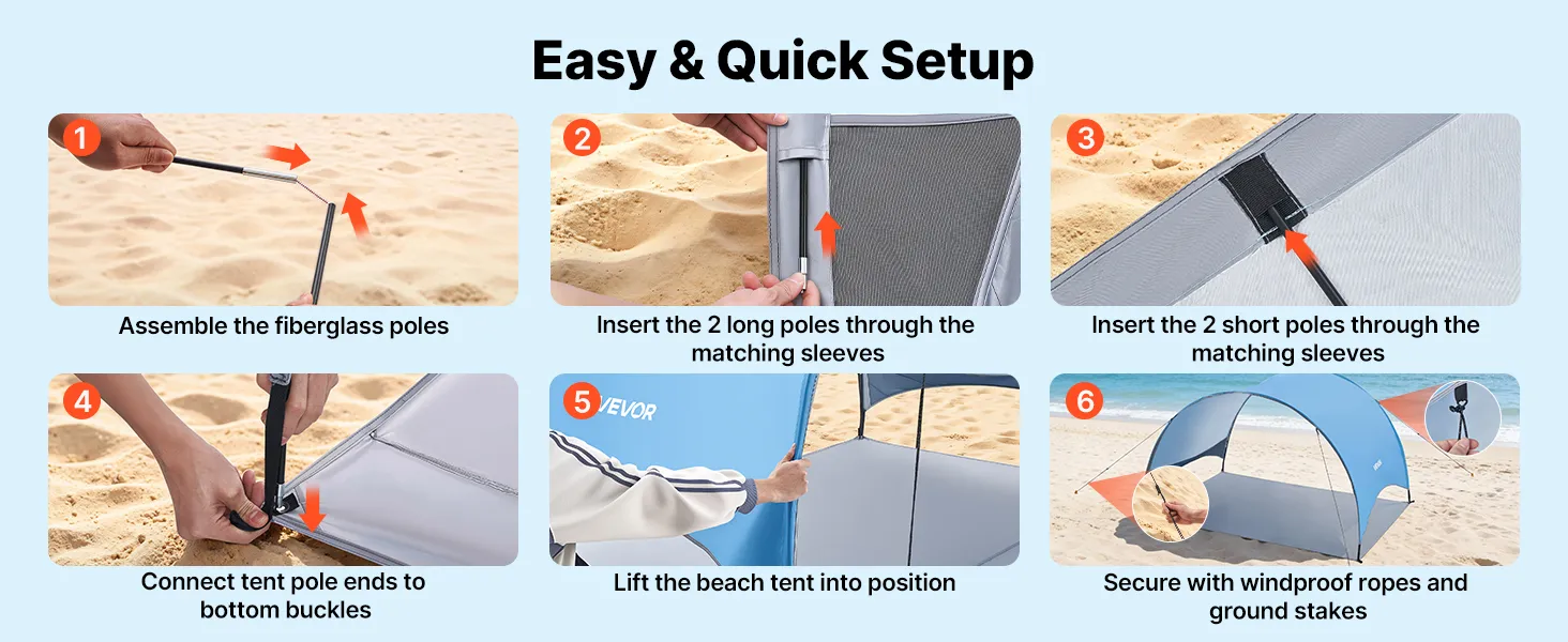 Featuring a simple and quick assembly process, the beach tent allows you to set up and take down the tent effortlessly, maximizing your leisure time.