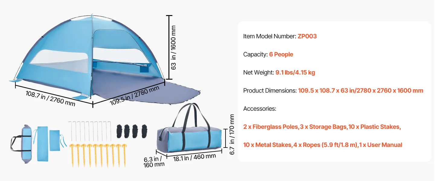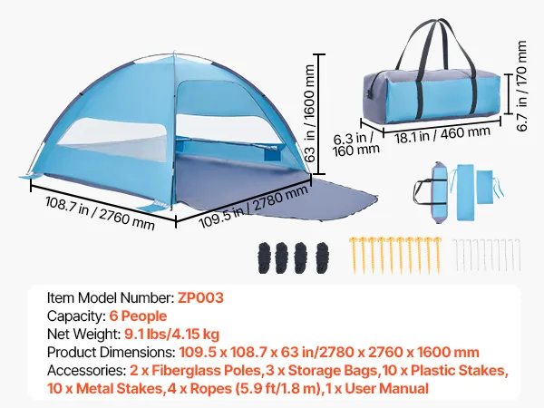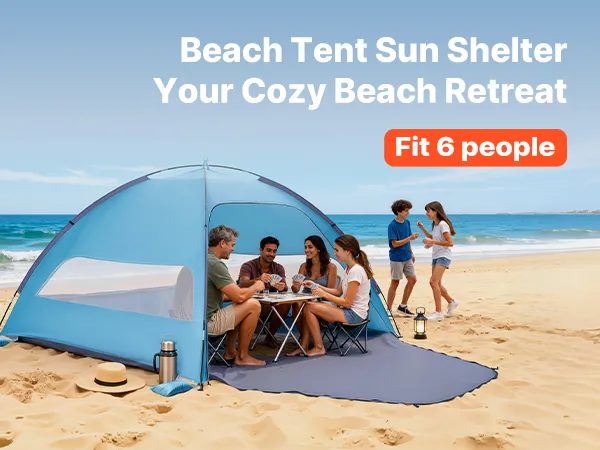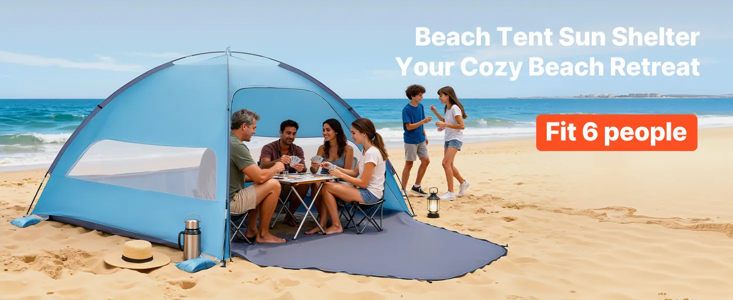 6-Person Beach Tent: Designed for families of six, our beach tent sun shelter provides spacious shade and a spacious room to relax. Setup is effortless—just a few minutes for a quick, stress-free assembly