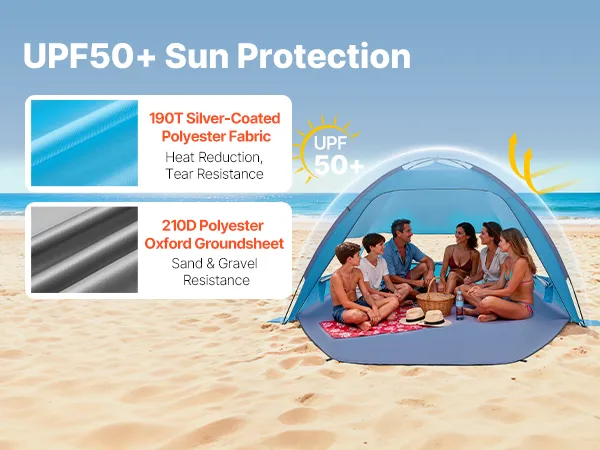 UPF 50+ Sun Protection: Crafted from 190T silver-coated polyester and boasting a UPF 50+ rating, this portable beach tent blocks harsh sunlight and provides heat insulation. The thick, durable fabric resists cracking and withstands long-term outdoor use
