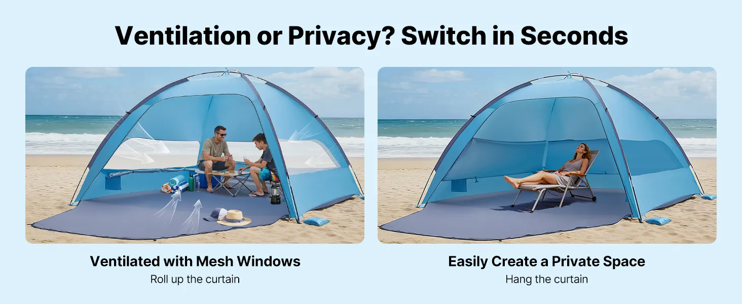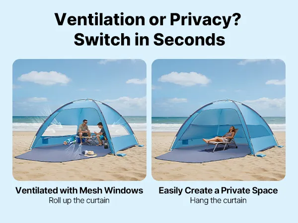 Ventilation & Privacy: Equipped with detachable curtains, our camping sun shelter allows you to roll them up for multi-sided airflow or hang them down to create a private space. It enables a flexible, user-friendly setup for any beach day