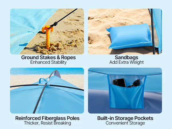 Wind-Ready Stability: Featuring upgraded thick fiberglass poles, windproof ropes, ground stakes, and sandbags, this sun shelter provides strength and corrosion resistance, staying steady and resisting collapse even in coastal winds