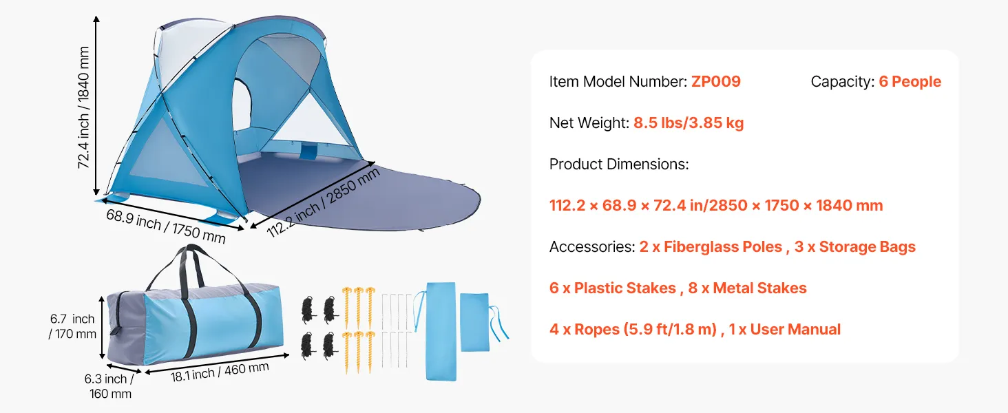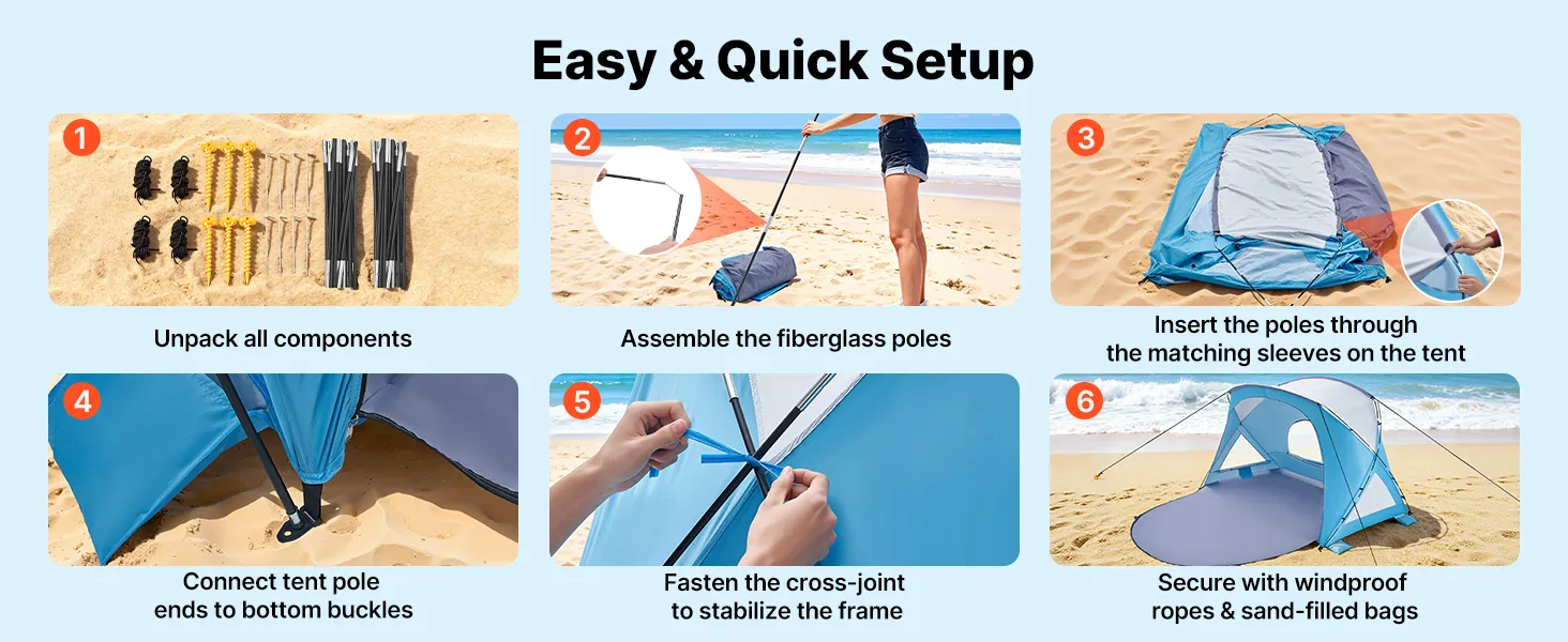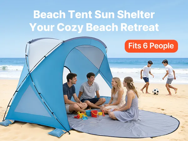 6-Person Beach Tent: Designed for families of six, our beach tent sun shelter provides spacious shade and a spacious room to relax. Setup is effortless—just a few minutes for a quick, stress-free assembly