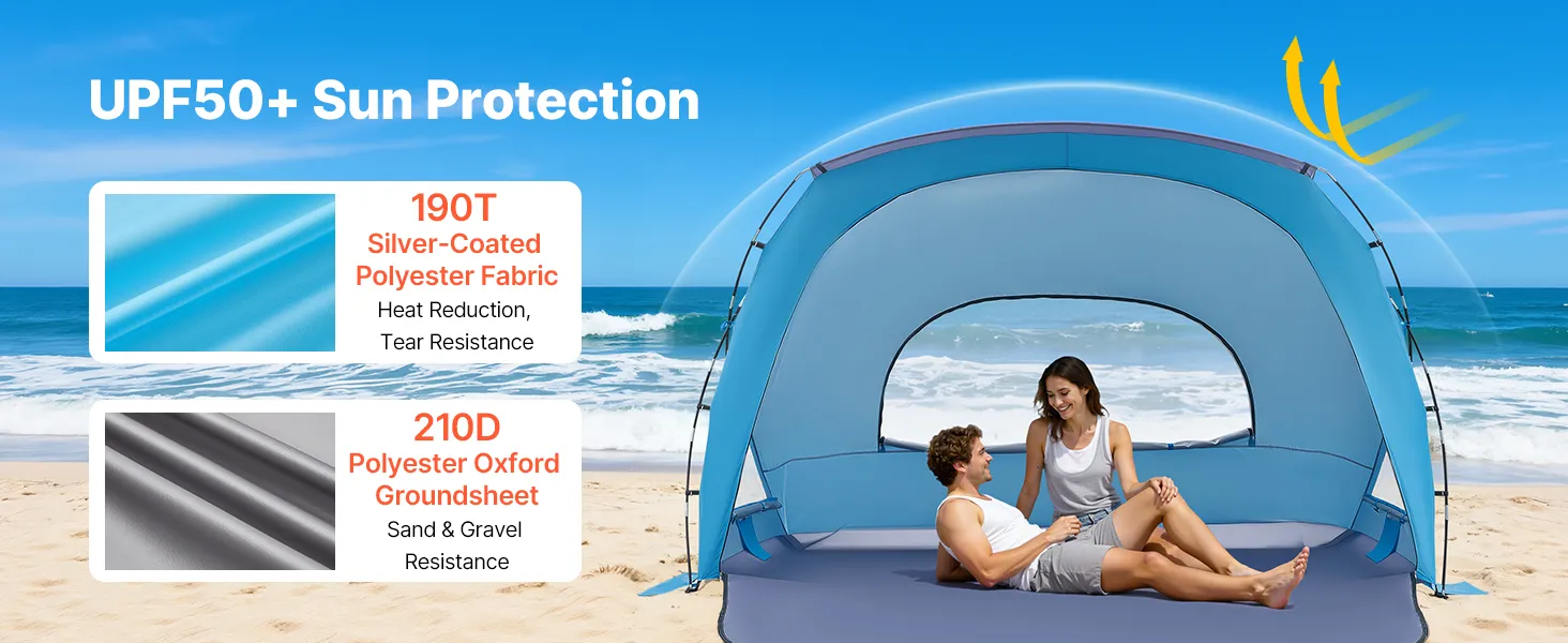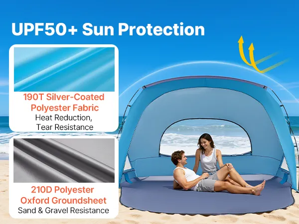 UPF 50+ Sun Protection: Crafted from 190T silver-coated polyester and boasting a UPF 50+ rating, this portable beach tent blocks harsh sunlight and provides heat insulation. The thick, durable fabric resists cracking and withstands long-term outdoor use