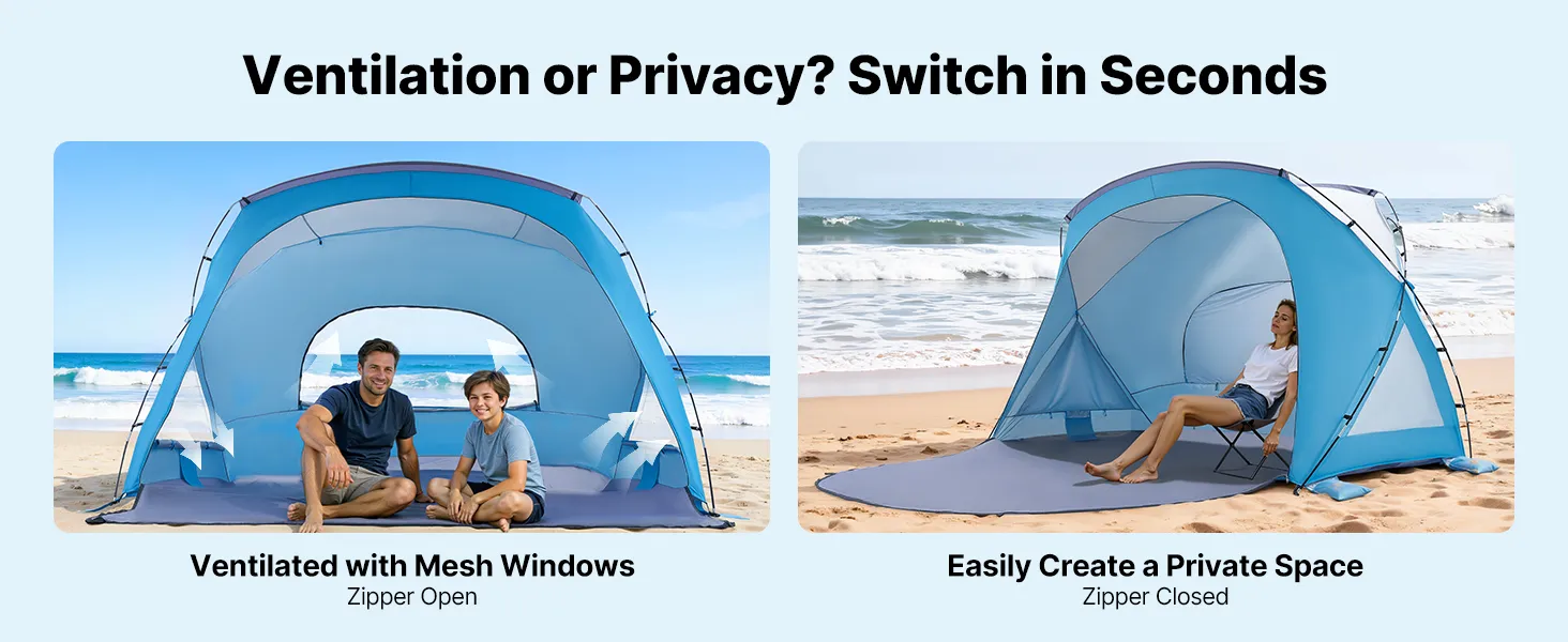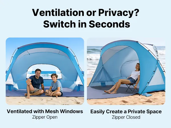 Ventilation & Privacy: Equipped with large mesh windows, our camping sun shelter allows multi-sided airflow for a cooler interior. The zippered panels can be closed to create a private space, delivering a flexible, user-friendly setup