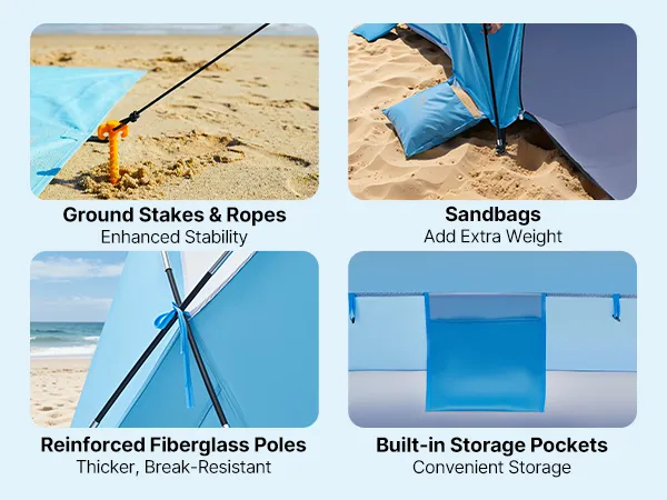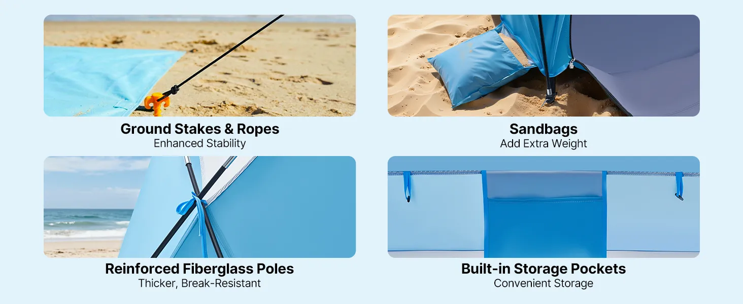 Wind-Ready Stability: Featuring upgraded thick fiberglass poles, windproof ropes, ground stakes, and sandbags, this sun shelter provides strength and corrosion resistance, staying steady and resisting collapse even in coastal winds