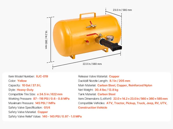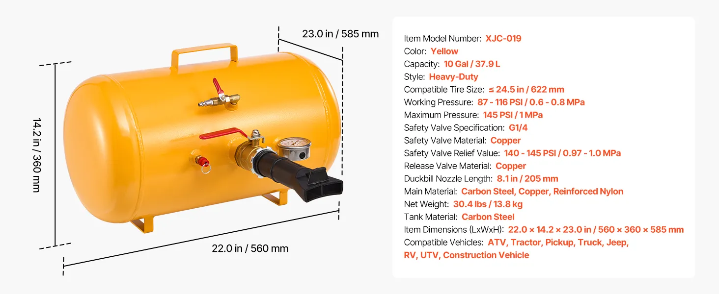 • Tire Compatibility: 10 Gal / 37.9 L cylinder, fits tubeless tires ≤ 24.5 in / 622 mm. Operating pressure: 87–116 PSI / 0.6–0.8 MPa. Suitable for ATVs, tractors, pickups, trucks, Jeeps, campers, and construction vehicles. Ideal for home garages, workshops, farms, and service stations