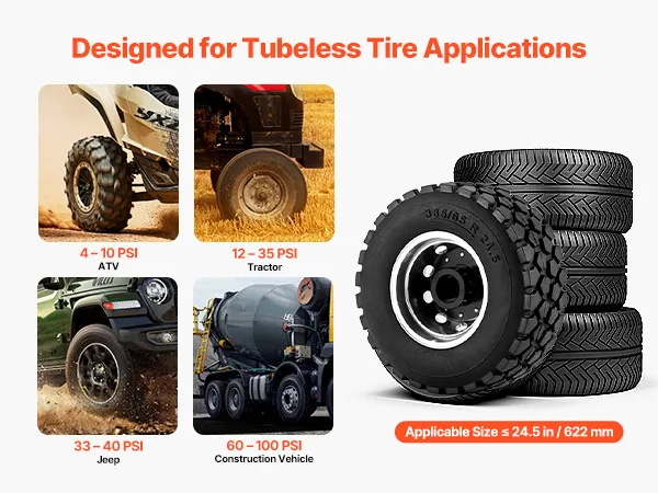 Supports tubeless tires ≤ 24.5 in / 622 mm, including heavy-duty vehicles like ATVs, tractors, pickups, trucks, Jeeps, campers, and construction vehicles. Operating pressure: 87–116 PSI / 0.6–0.8 MPa. You can adjust inflation according to tire size.