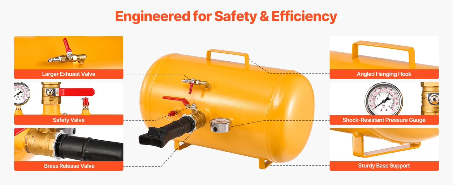 • Security Features: High-pressure steel cylinder resists deformation and leakage over long-term use. The bead blaster is equipped with a safety valve that releases excess pressure beyond the max working limit. Long-neck design keeps a secure distance