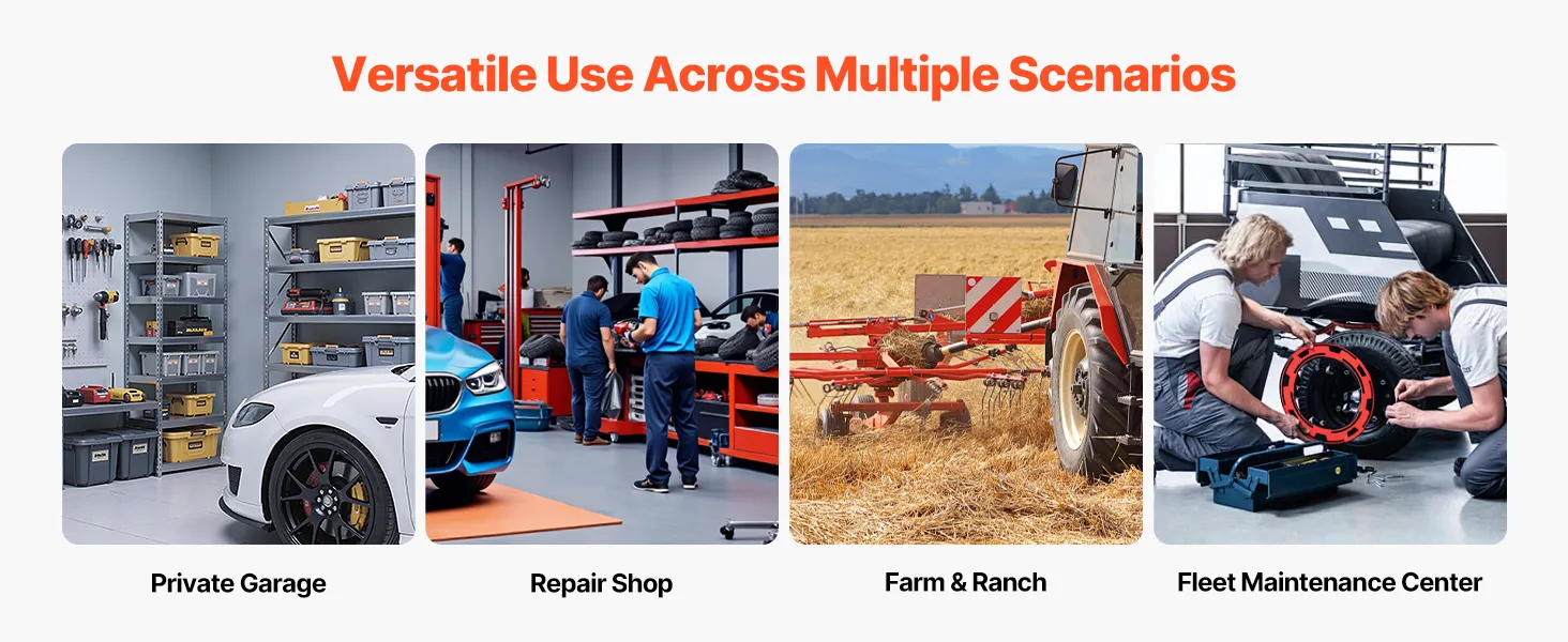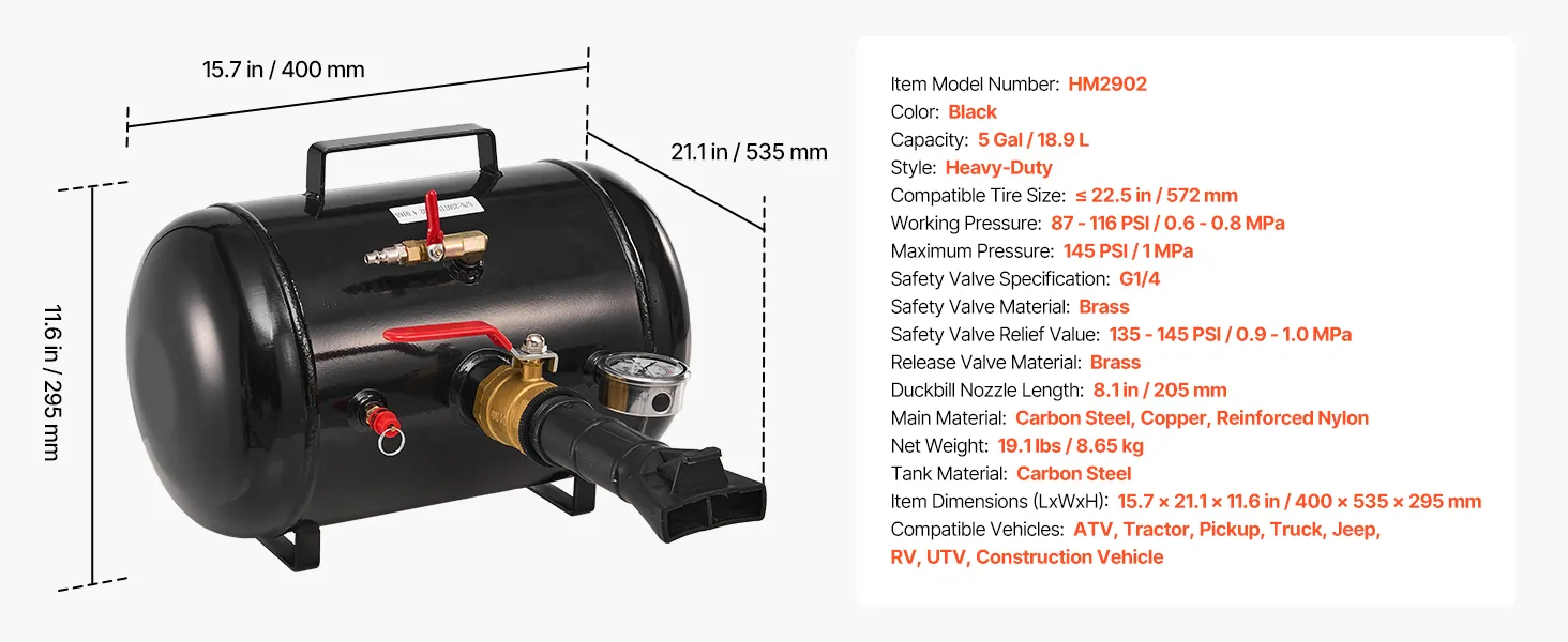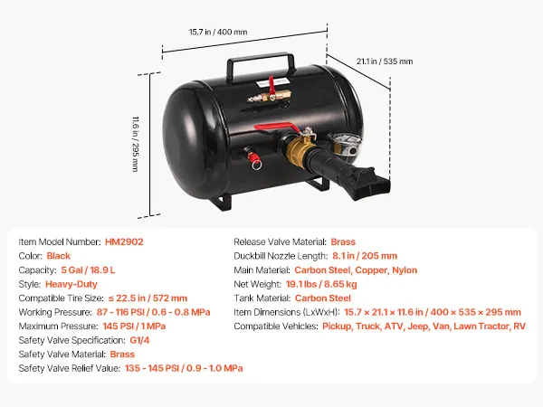 Tire Compatibility: 5 Gal / 18.9 L cylinder, fits tubeless tires ≤ 22.5 in / 572 mm. Operating pressure: 87–116 PSI / 0.6–0.8 MPa. Suitable for ATVs, tractors, pickups, trucks, Jeeps, campers, and construction vehicles. Ideal for home garages, workshops, farms, and service stations