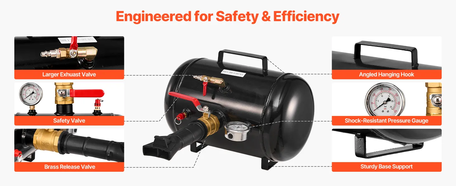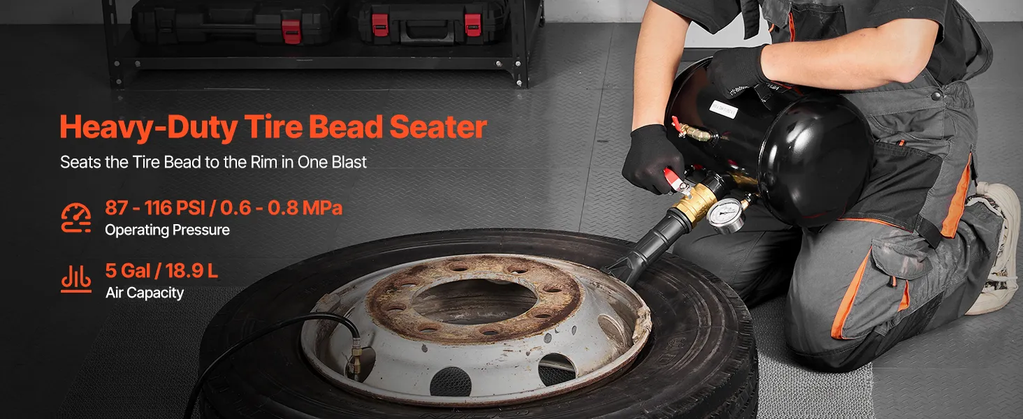 5 Gal / 18.9 L heavy-duty tire bead seater quickly releases high-pressure air, seating the tire bead in the correct position in just 1 second and making heavy tire bead sealing faster and easier.