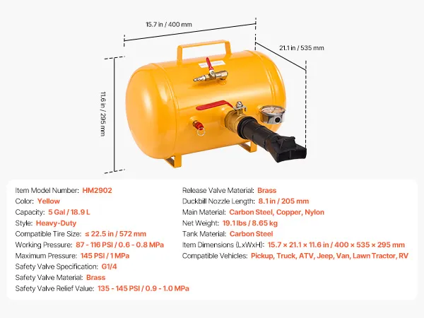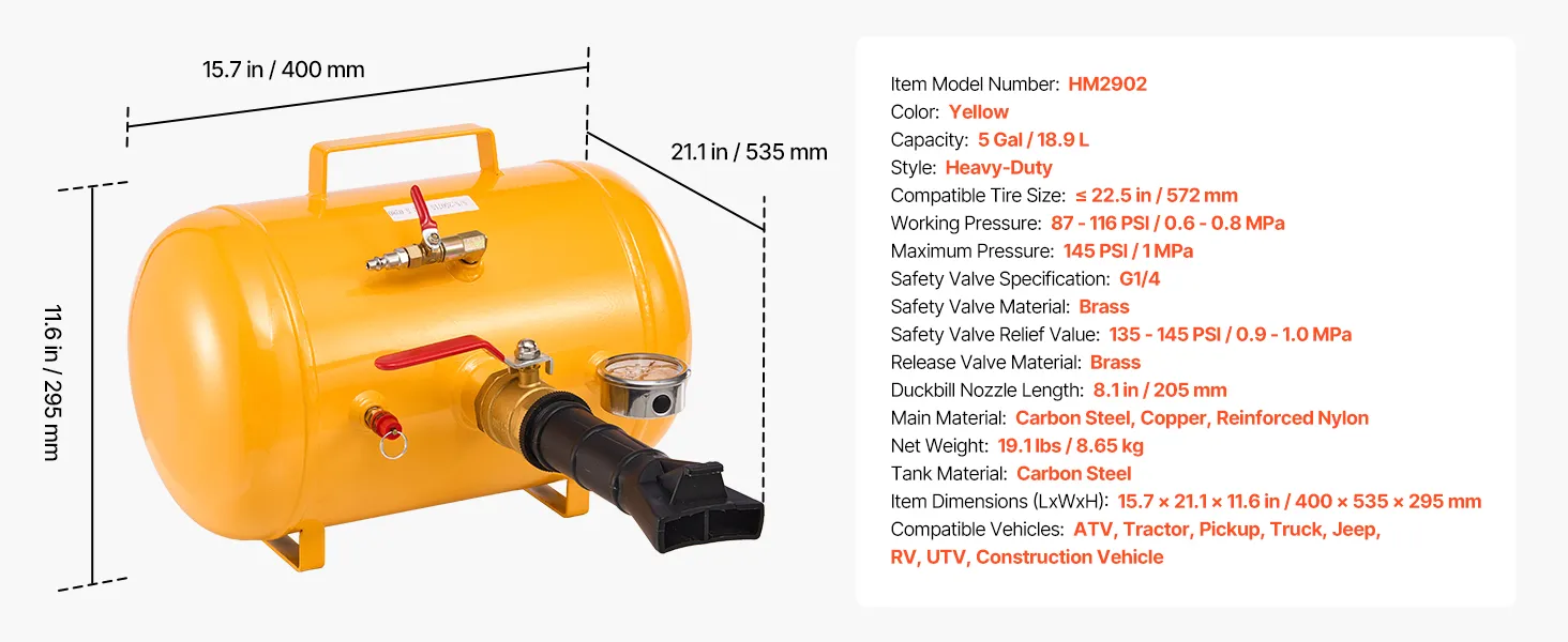 Tire Compatibility: 5 Gal / 18.9 L cylinder, fits tubeless tires ≤ 22.5 in / 572 mm. Operating pressure: 87–116 PSI / 0.6–0.8 MPa. Suitable for ATVs, tractors, pickups, trucks, Jeeps, campers, and construction vehicles. Ideal for home garages, workshops, farms, and service stations